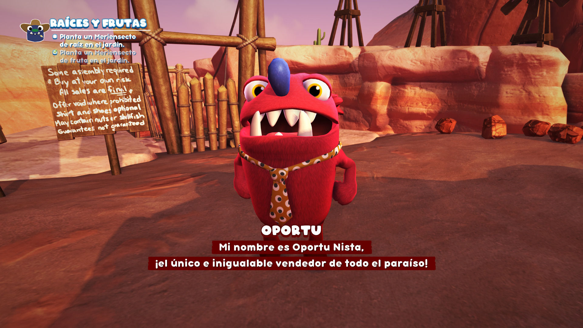 Así, el mapa de la isla se divide en varias zonas estructuradas como en un plataformas de Nintendo: el área de nieve, un desierto, una playa… En cada uno de estos pequeños lugares hay un personaje con su motivo para haber abandonado Pueblo Picnic, pero al que podemos convencer de que vuelva tras cumplir una serie de misiones para él, todas centradas en la caza de Meriensectos — cuando los comen, podemos elegir una parte de su cuerpo para que se transforme según el snack viviente que se haya comido, algo que no tiene impacto en la jugabilidad, pero que es bastante gracioso.