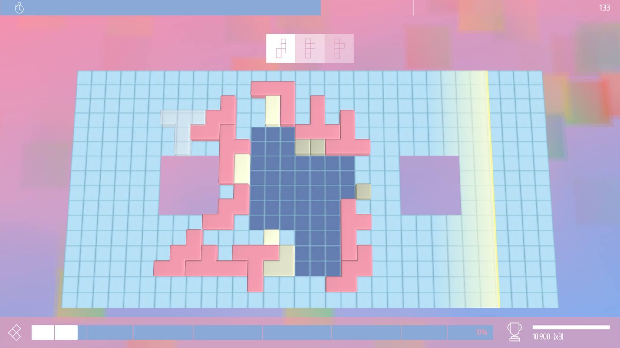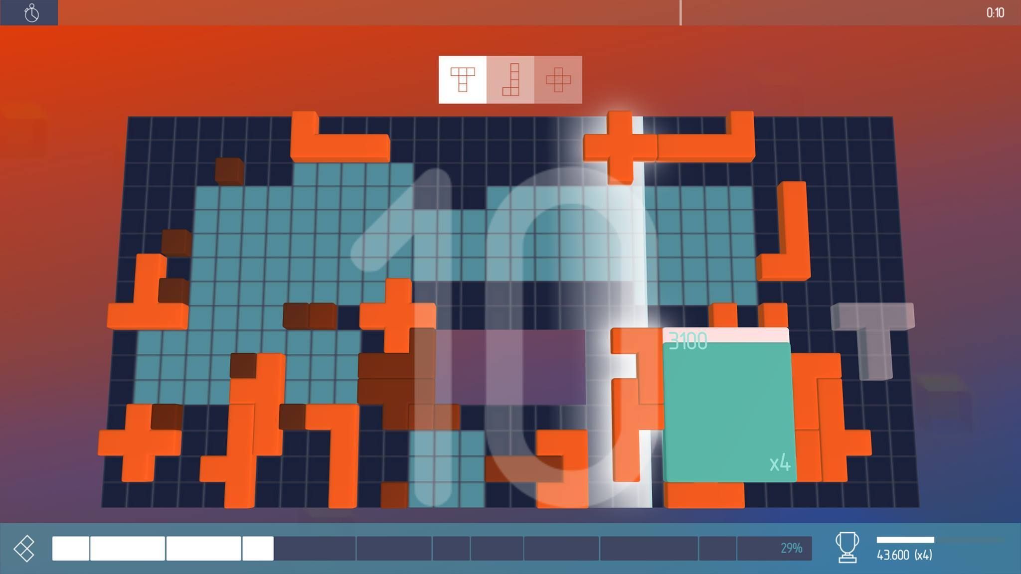 Efectivamente, es otro juego de puzles basado en formar bloques –de cinco cubos, lo que permite algunas siluetas nuevas respecto a Tetris-, aunque a diferencia de otros títulos, aquí las piezas no caen de la parte superior, sino que podemos crear las siluetas en cualquier dirección dentro del espacio dado, e incluso compaginar varios cuadrados y rectángulos en diversos puntos de la rejilla. Esta es en realidad la mejor estrategia en nuestros primeros pasos, da un aspecto más caótico que intentar formar un bloque enorme y ordenado, pero suele lograr una mejor recompensar.