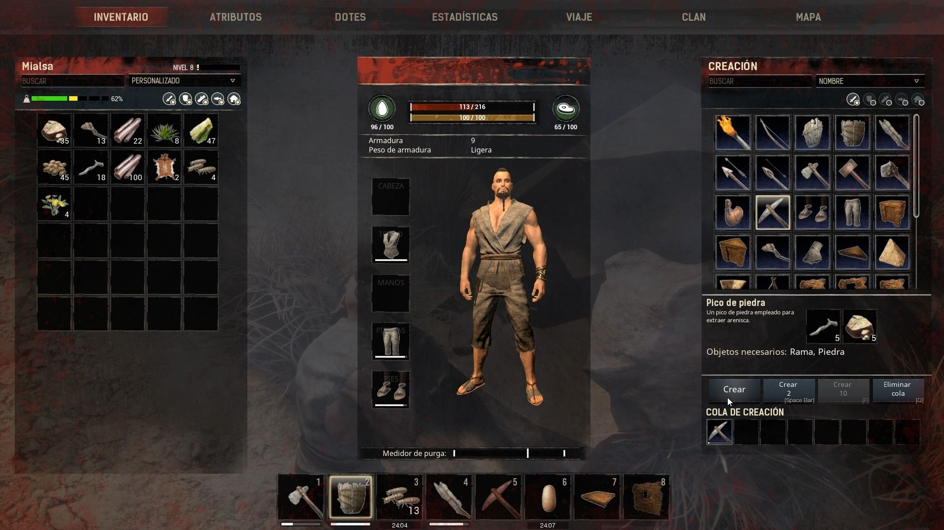 Para mejorar nuestras opciones de seguir con vida vamos a poder crear multitud de herramientas, armas, protecciones y edificaciones. Para ello se ha implementado el clásico sistema de recolección de materiales (rocas, plantas, madera...) pudiendo posteriormente combinarlos en un sencillo menú de creación. Gracias a esta funcionalidad diseñaremos herramientas para optimizar la recogida de materiales, armas para ser más efectivos en el combate o protecciones para evitar muertes innecesarias.