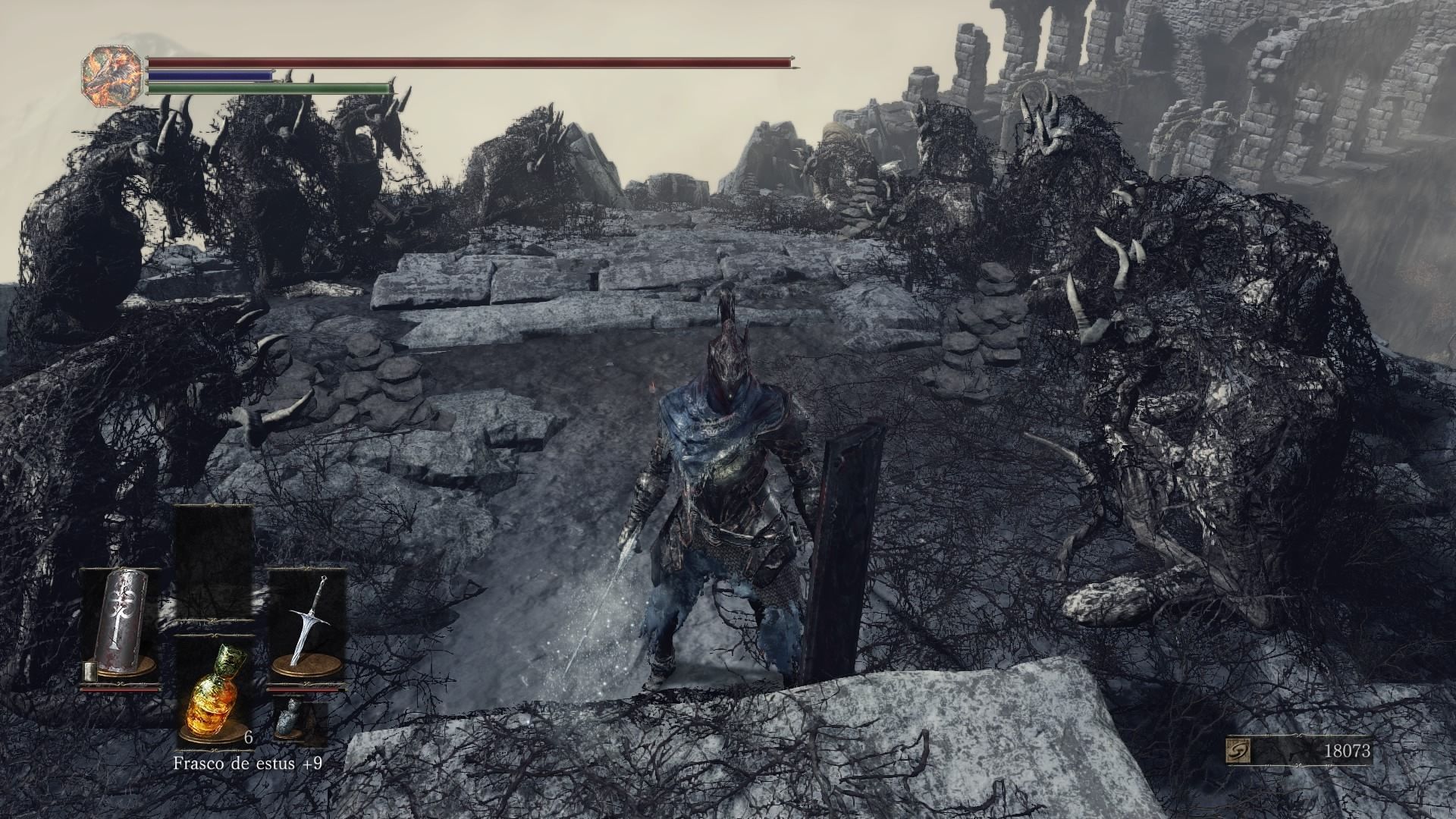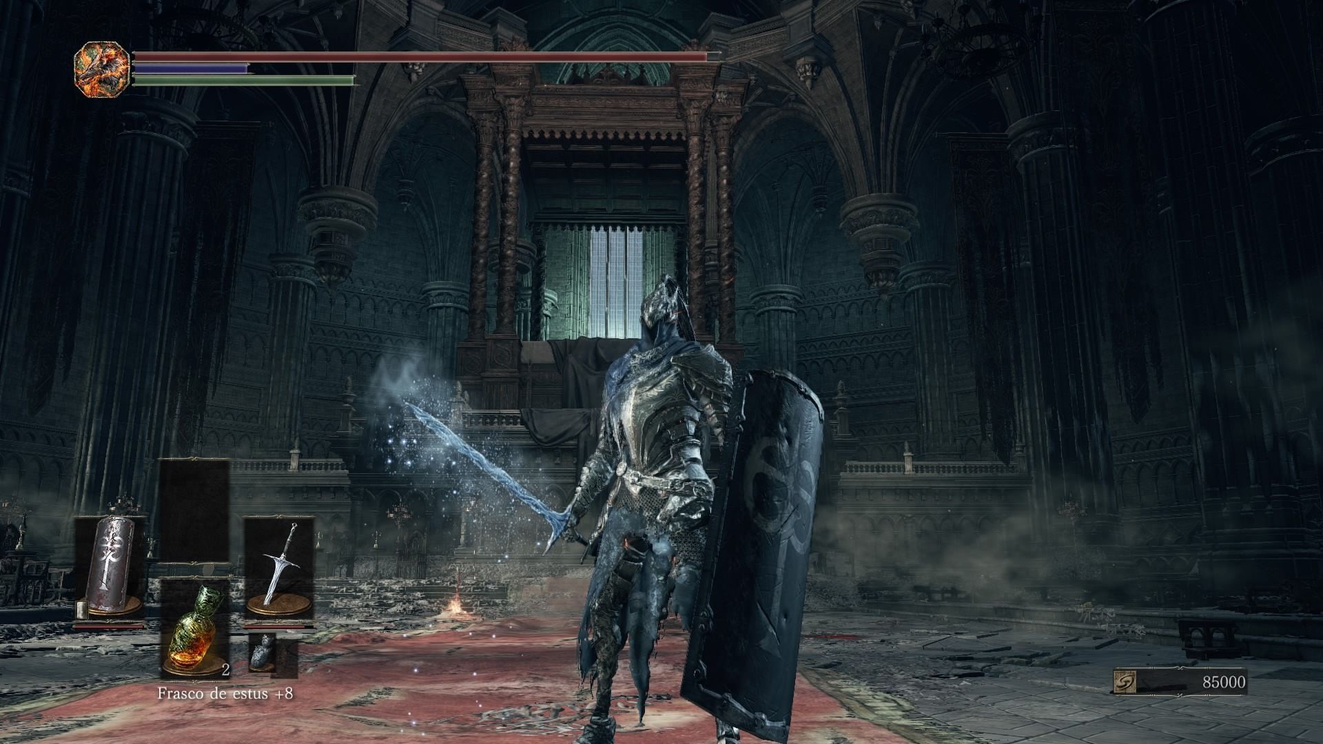 Esto puede que a muchos os recuerde a Bloodborne, pero podéis estar tranquilos, ya que a pesar de ello sigue sintiéndose puramente Dark Souls. Saber bloquear, defenderse y esperar el momento adecuado para contraatacar continuarán siendo nuestras prioridades, ciertas animaciones como la de darle tragos a los estus siguen resultando algo lentas y nos obligarán a buscar el momento adecuado para reponer nuestras fuerzas y no recibir otro golpe, y nuestra barra de energía baja a una velocidad altísima para reponerse a un ritmo relativamente lento.