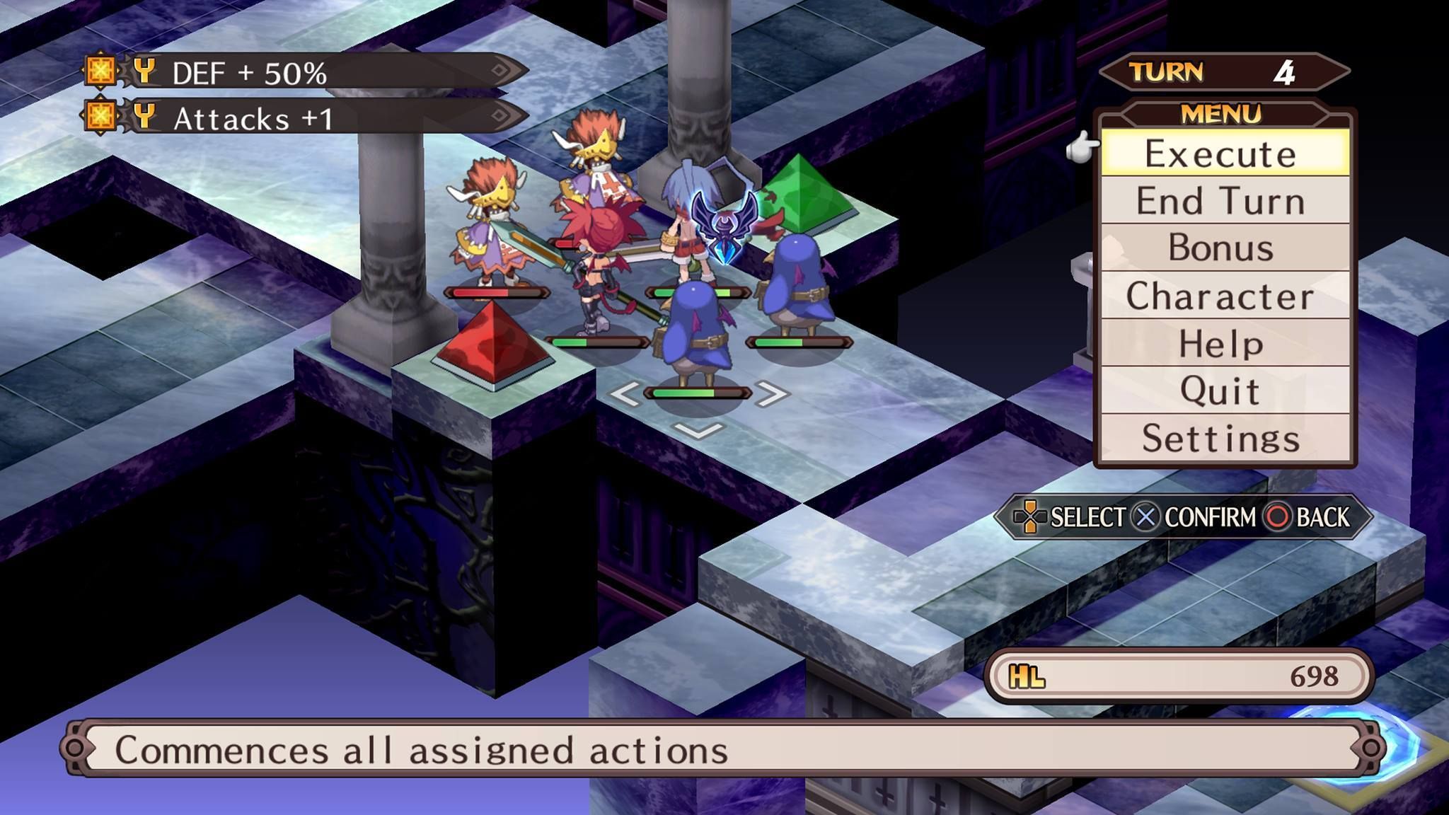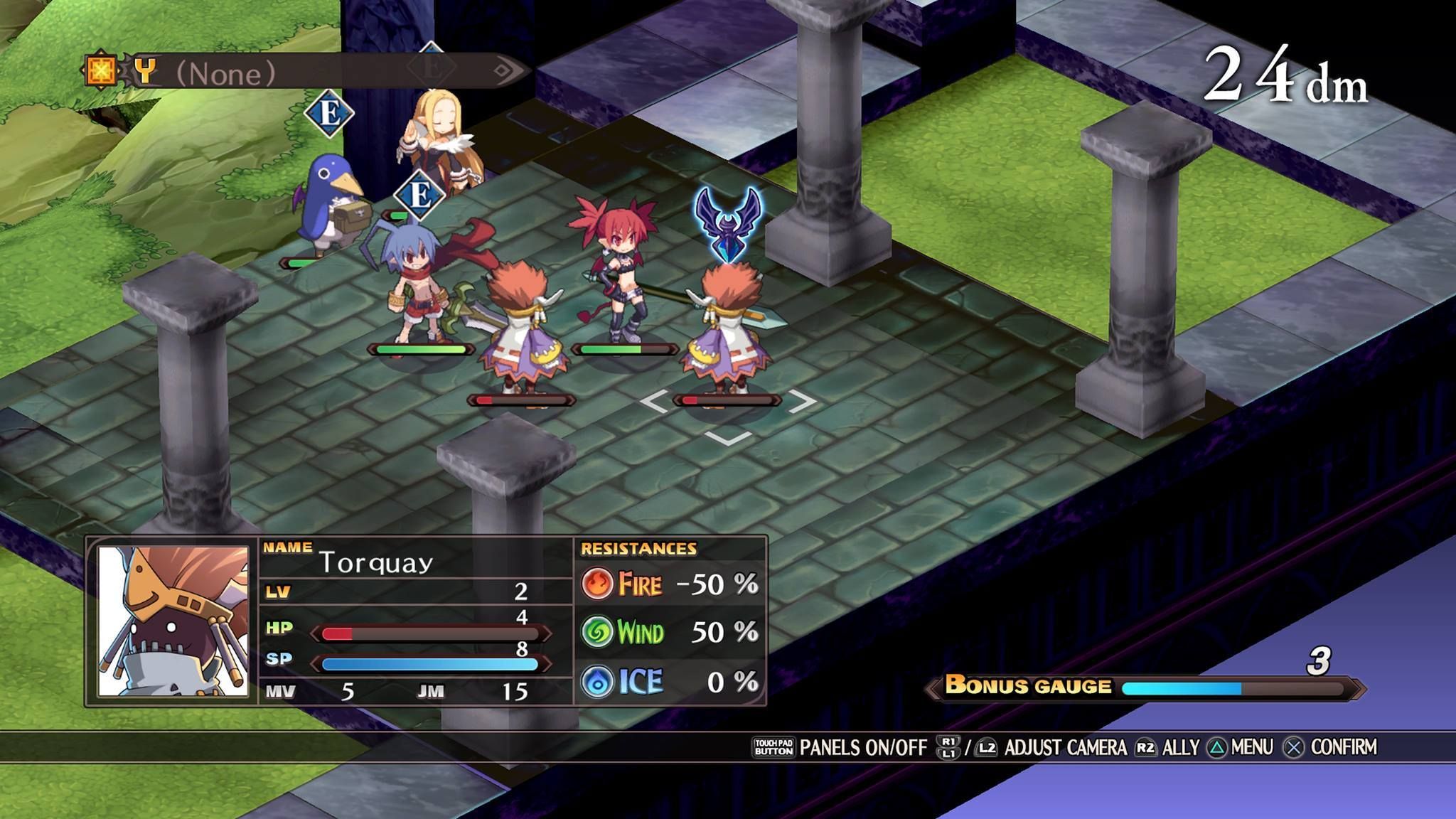 En cuanto al desarrollo, tenemos el mismo esquema que han utilizado el resto de secuelas: desde nuestra base, con tiendas, acceso al Item World, curación de personajes y demás, tenemos un portal para avanzar por capítulos en los que desbloqueamos mapas y eventos con diálogos. Si es tu primer RPG de estrategia por turnos, no temas, el tutorial inicial cubre lo básico de los Disgaea, incluyendo el movimiento por casillas, ataques, lanzamiento de personajes o enemigos, y los Geo paneles que afectan con estados beneficios –o negativos- a las unidades que se sitúan en ciertas zonas del mapa.