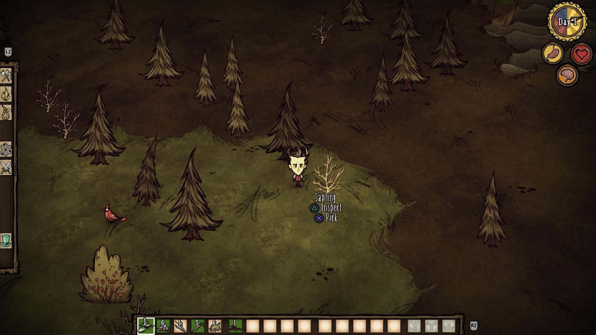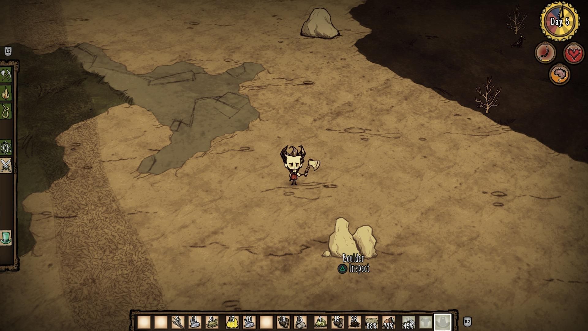 El paso del ratón y teclado a los mandos no es algo que todos hagan bien, pero Don’t Starve lo ha hecho con soltura. Una mezcla de stick derecho y cruceta nos permite interactuar con nuestro inventario de manera rápida, y con R2 podemos desplegarlo y organizarlo o utilizarlo con mayor profundidad. Con L2 abrimos el menú lateral, que nos sirve para crear diferentes objetos. Tras el primer contacto algo chocante, si venimos de la versión de PC, descubriremos que es un esquema bastante cómodo, con el que se juega perfectamente.
