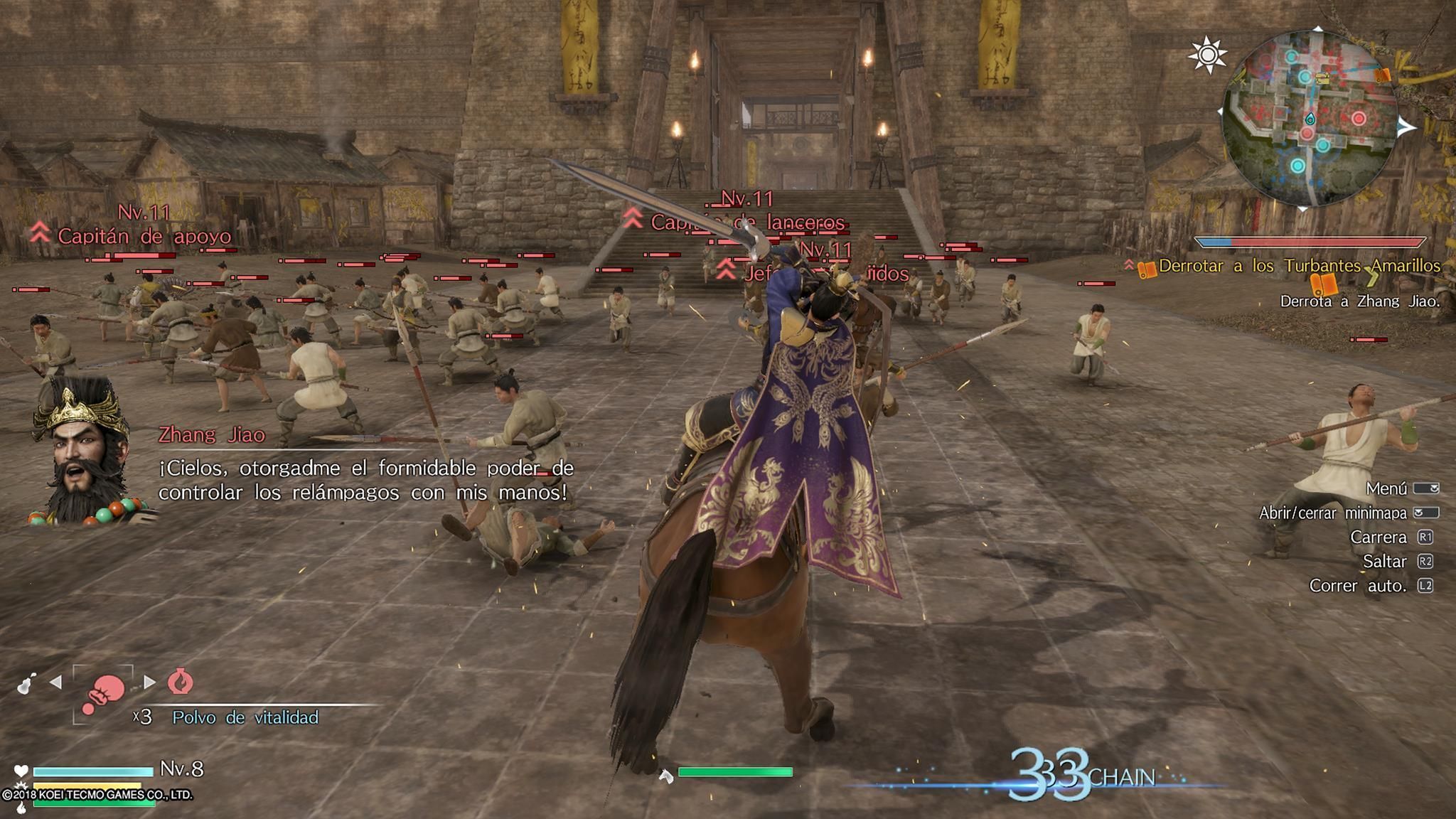 El juego comienza con la Rebelión de los Turbantes amarillos y a lo largo de varios capítulos veremos diversos conflictos, traiciones y ejércitos enfrentados con más de 80 personajes históricos, aunque no todos disponibles desde el inicio. Dynasty Warriors 9 nos llega con textos en español y voces con varias opciones –entre ellas inglés-, lo cual hace mucho más cómodo seguir el argumento y los encargos recibidos. Al menos, gracias a esto, sus diálogos han ganado peso.