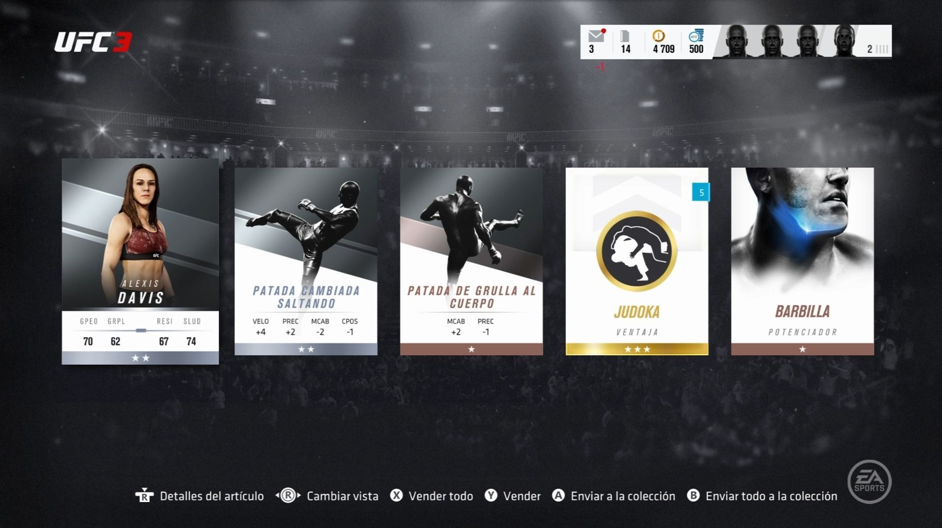 El modo Ultimate Team no podía faltar en UFC 3. El sistema es el de siempre, mediante sobres (que podremos comprar con dinero real o monedas del juego) conseguiremos cromos de luchadores, movimientos, contratos o, por ejemplo, habilidades, formando un roster de peleadores que podremos personalizar libremente. Al competir iremos avanzando en el sistema de divisiones, siendo posible disfrutar de dicho modo tanto offline como online. Además, tendremos multitud de retos disponibles con interesantes recompensas, lo que garantiza un constante flujo de dinero. Sin duda, este modo de juego ofrece un sistema de competición divertido y un nivel de personalización realmente adictivo, por lo que será una opción ideal para disfrutar durante muchas horas.