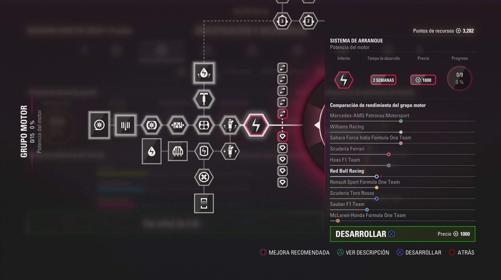 En este modo no solo tendremos que correr, sino también gestionar la evolución de nuestro monoplaza y cumplir con una serie de retos adicionales. En lo que respecta a las mejoras en el coche, se incorpora un completo árbol de desarrollo dividido en cuatro categorías: aerodinámica, durabilidad, grupo motor y chasis. Para ir desbloqueando mejoras tendremos que conseguir puntos, los cuales irán relacionados con nuestro rendimiento y el cumplimiento de los objetivos primarios y secundarios de la temporada.