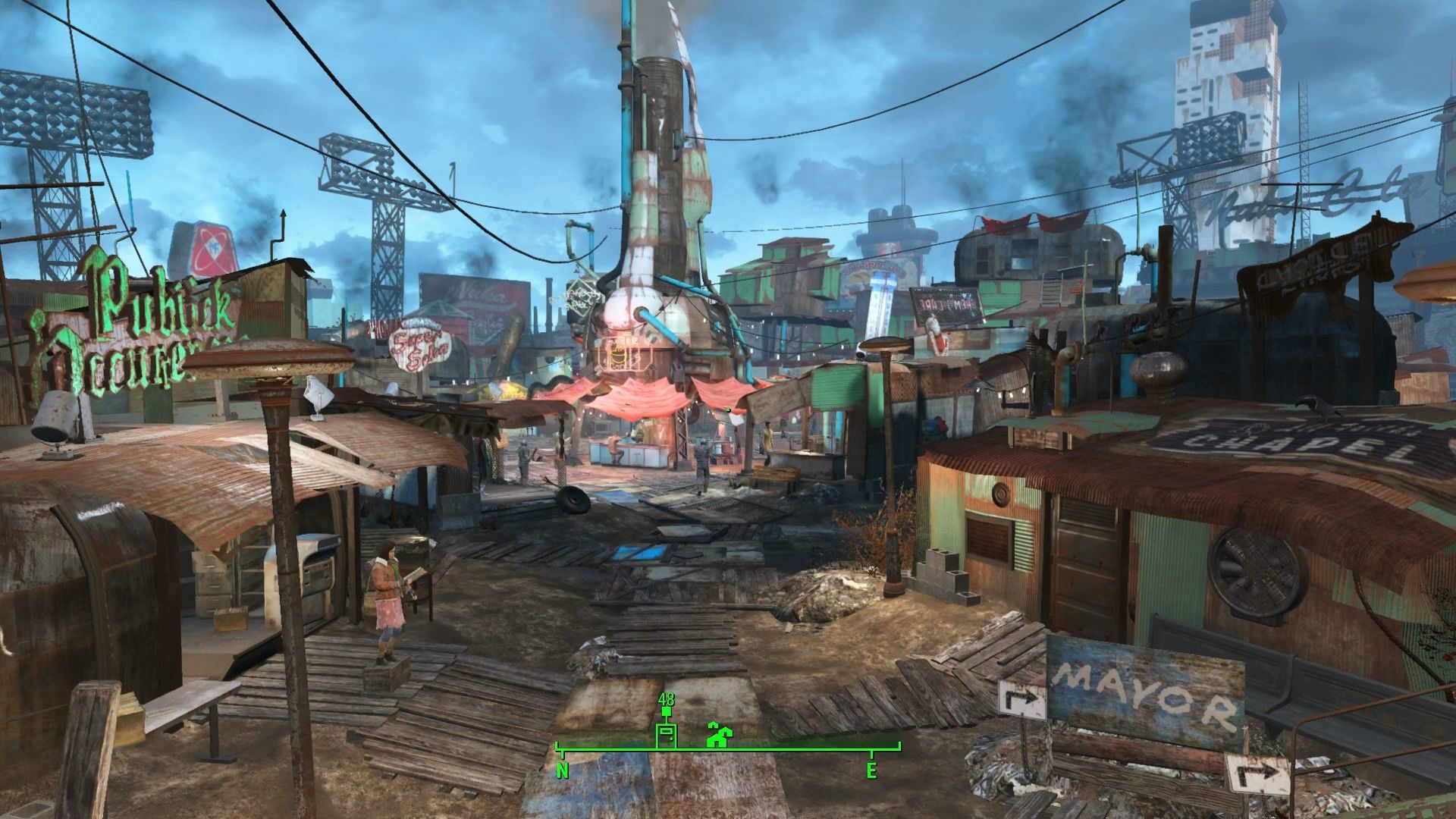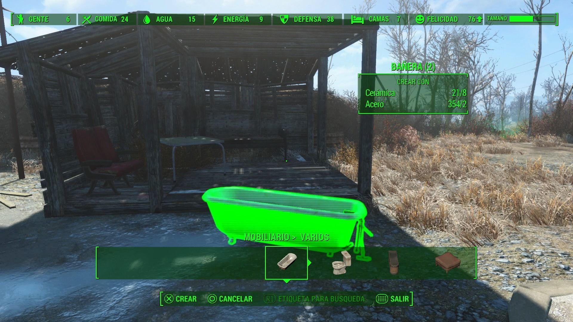 A la hora de cocinar alimentos, construir objetos, crear drogas o mejorar las armas lo tenemos que hacer en unos bancos de trabajo que se encuentran en los asentamientos, la otra gran novedad de Fallout 4. Pequeñas poblaciones que puedes gestionar para obtener recursos y beneficios, y que puedes construir y mejorar a tu gusto. Cada asentamiento tiene un número de habitantes -puedes ampliarlo o reducirlo atrayendo a gente o moviéndola a otros asentamientos-, un número de comida que se produce al día -se pueden crear huertos con distintos tipos de alimentos, aunque debes contar con alguien que los cuide-, tienes que crear pozos para que haya agua, y generadores para que no falte energía y puedan funcionar partes como el alumbrado o distintas máquinas. También tienes que contar con defensa para proteger el asentamiento de posibles ataques, y camas suficientes para todos los habitantes. Dependiendo de cómo cumplas estos requisitos, será más o menos alto el valor de felicidad, lo que se traduce en mayor productividad de los colonos a la hora de obtener recursos.