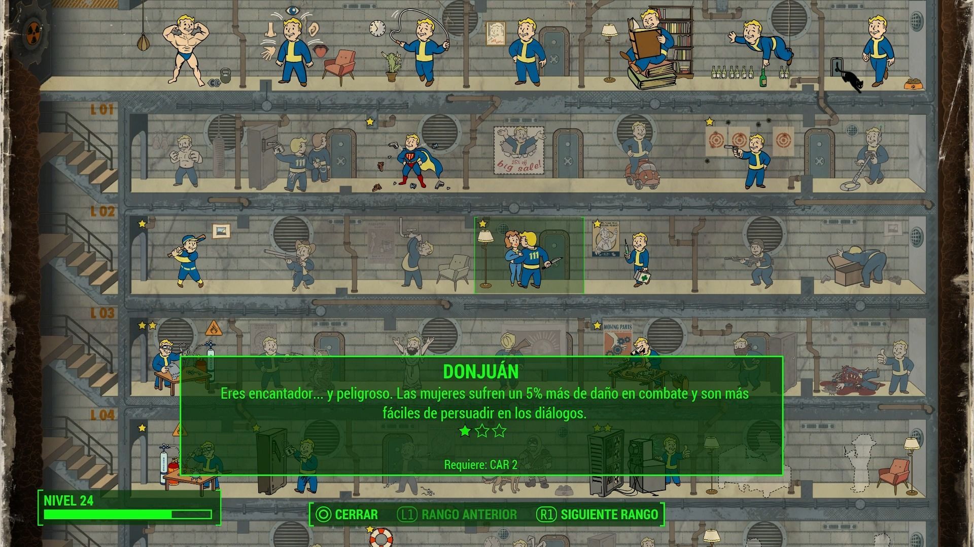 Otro cambio importante en Fallout 4 es su nuevo sistema de progresión, un completo acierto, ofreciendo al jugador una libertad enorme desde el principio de la aventura para hacer un personaje a su medida. Tenemos siete atributos principales S.P.E.C.I.A.L: fuerza, percepción, resistencia, carisma, inteligencia, agilidad y suerte, entre los que repartimos una serie de puntos al comenzar el juego, y dentro de cada una de estas categorías diez habilidades o perks, que a su vez podemos mejorar en varios niveles. Por ejemplo para acceder a la quinta habilidad de resistencia (‘acuático’, nos sufres daño de radiación al nadar) tendrás que tener al menos cinco puntos en resistencia, y así sucesivamente, con los diez niveles de habilidades, y cada una de ellas con varias mejoras, que exigen a su vez haber alcanzado cierto nivel de experiencia.