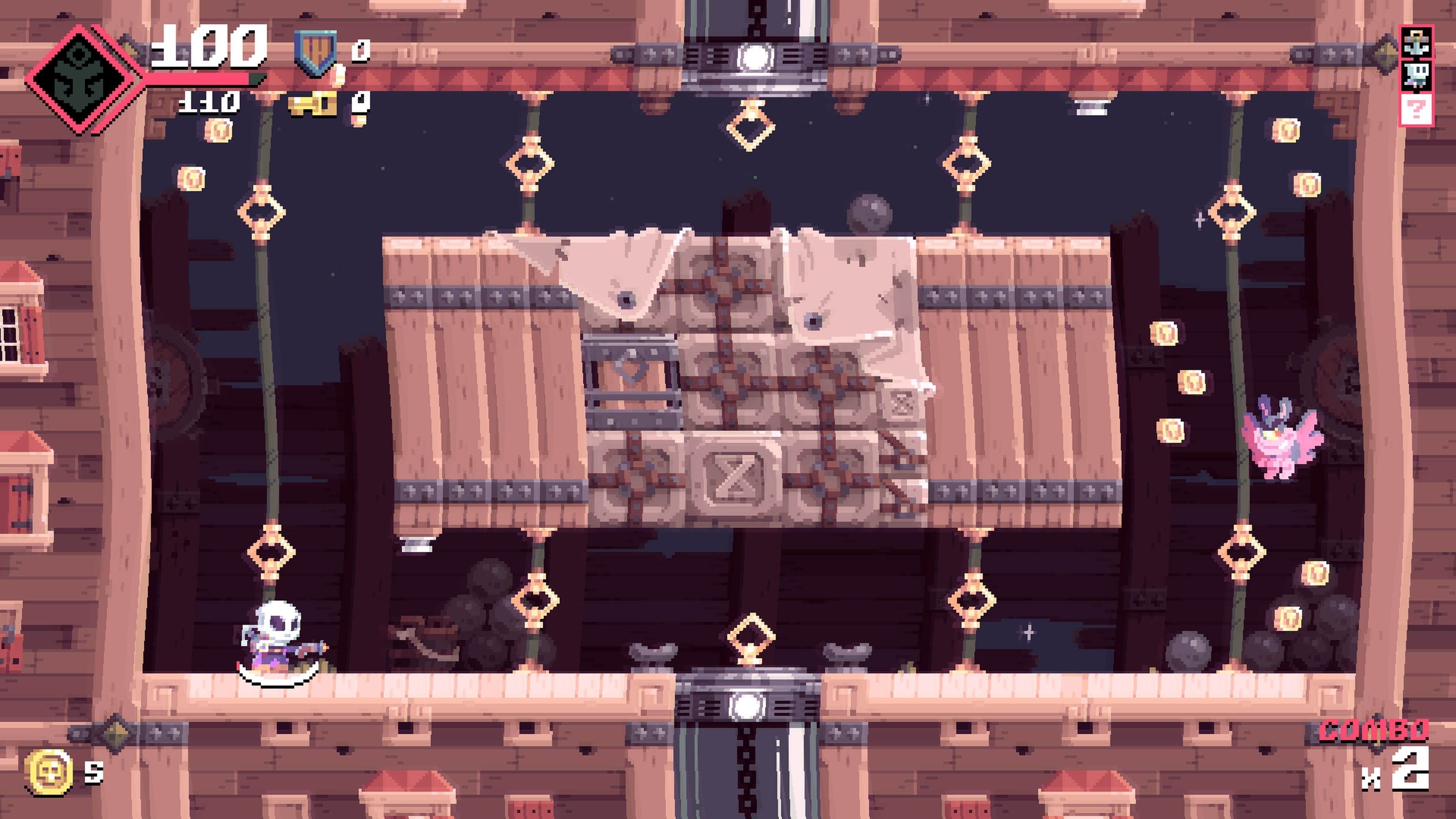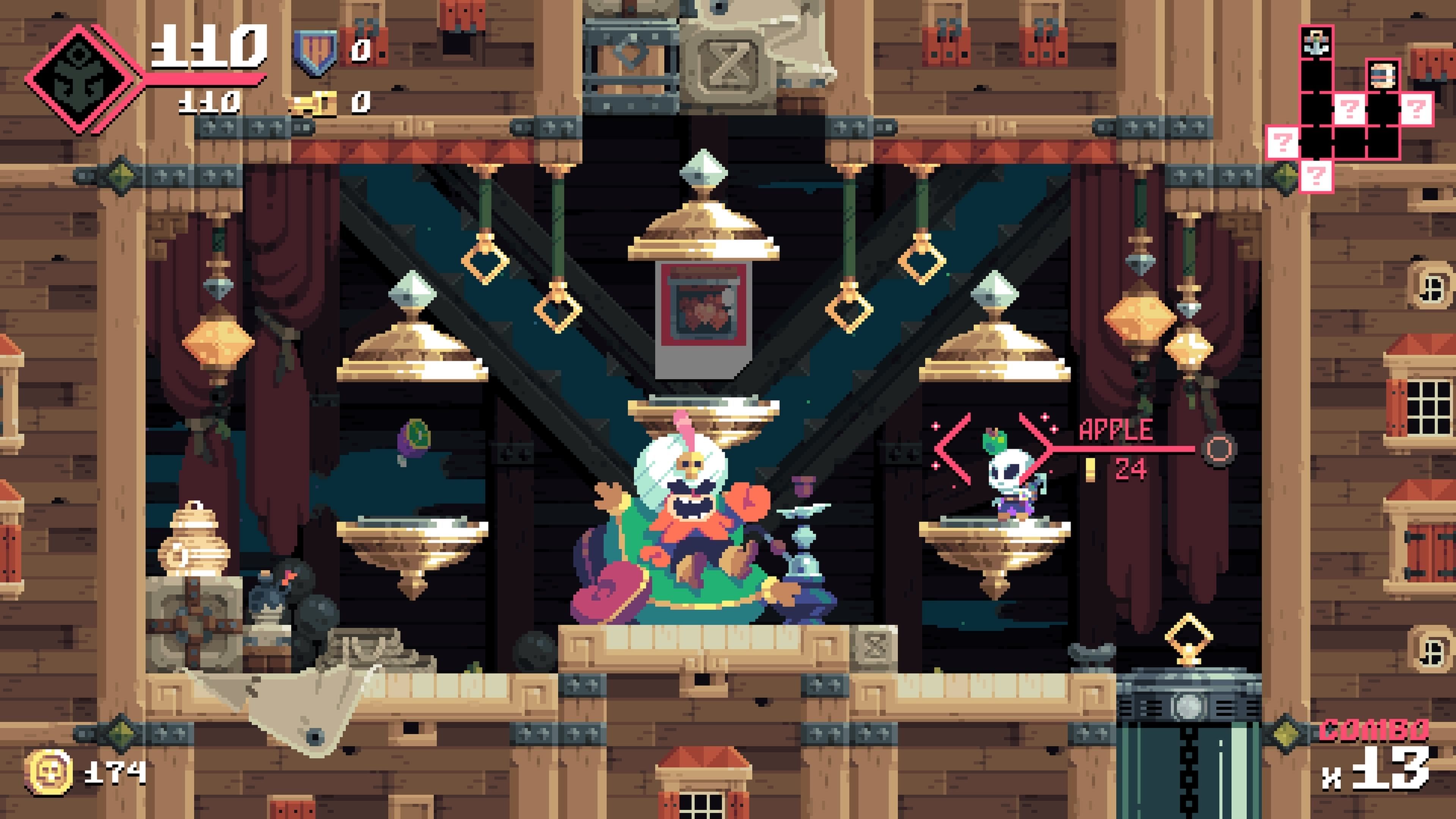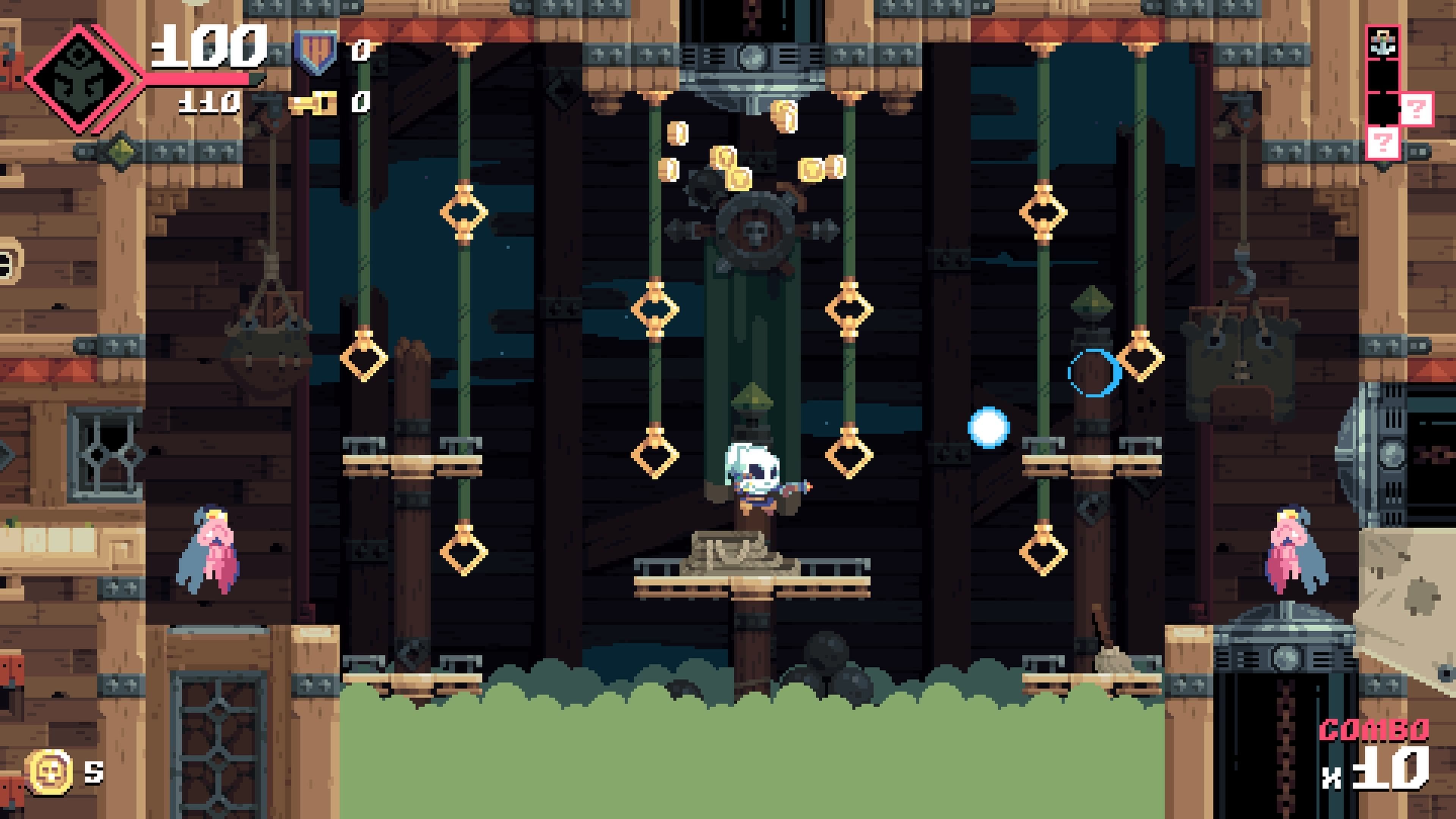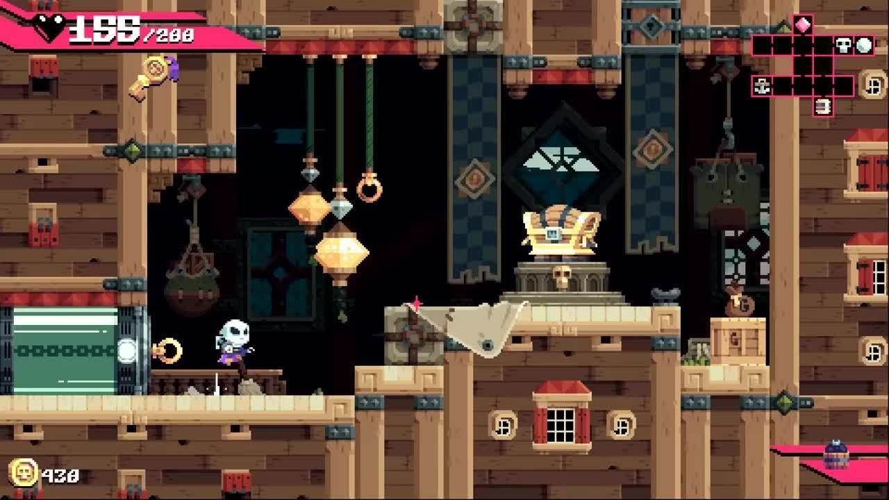 La estructura que poseen dichos fondos es muy llamativa. Cada uno está compuesto por un número variable de salas que están comunicadas entre sí por una o varias entradas o accesos, algo que nos ha recordado bastante a la serie Metroid. Lo interesante es que cada una de estas salas nos ofrece un reto claramente diferente cada vez, ya que las hay repletas de enemigos que debemos ir liquidando conforme aparecen (además existe una variedad de ellos bastante generosa), otras en las que las plataformas son las grandes protagonistas, otras albergan tiendas improvisadas, salas de tesoros… Y, cómo no, una de ellas está destinada al enemigo final de turno, que suele ponernos las cosas más difíciles de lo que ya son.