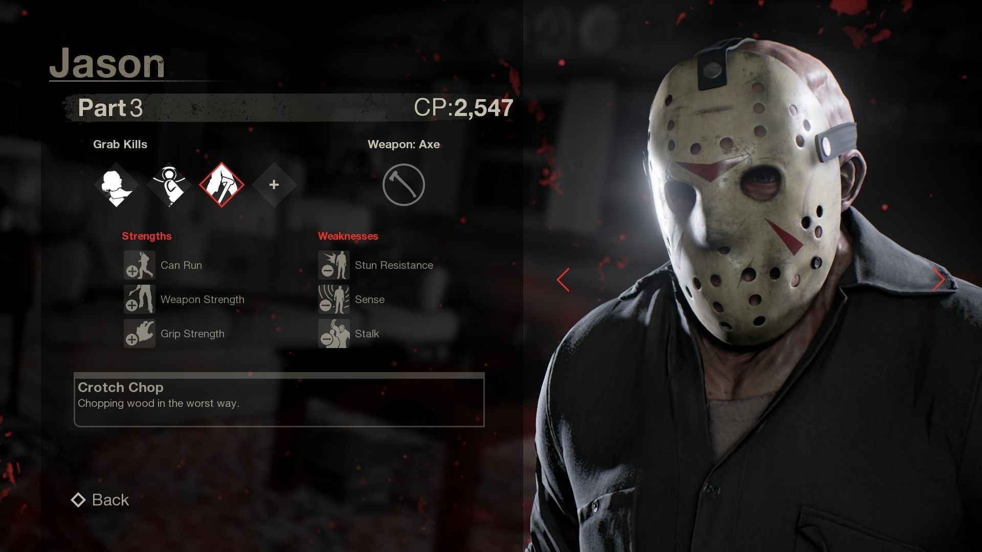 Además, el videojuego cuenta con varias versiones de Jason Voorhees sacadas directamente de las distintas películas y, más allá de los evidentes cambios estéticos, cada una tiene tres habilidades positivas, como nadar más rápido o no hacer ruido, y otras tres negativas, pudiendo incluso perder la capacidad de correr. Mención especial merece el gran trabajo de modelado de los distintos Jason, así como las contundentes animaciones capaces de transmitir toda la violencia y agresividad del mítico personaje.