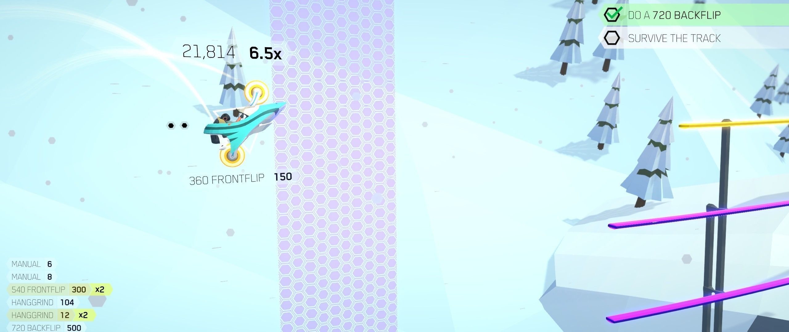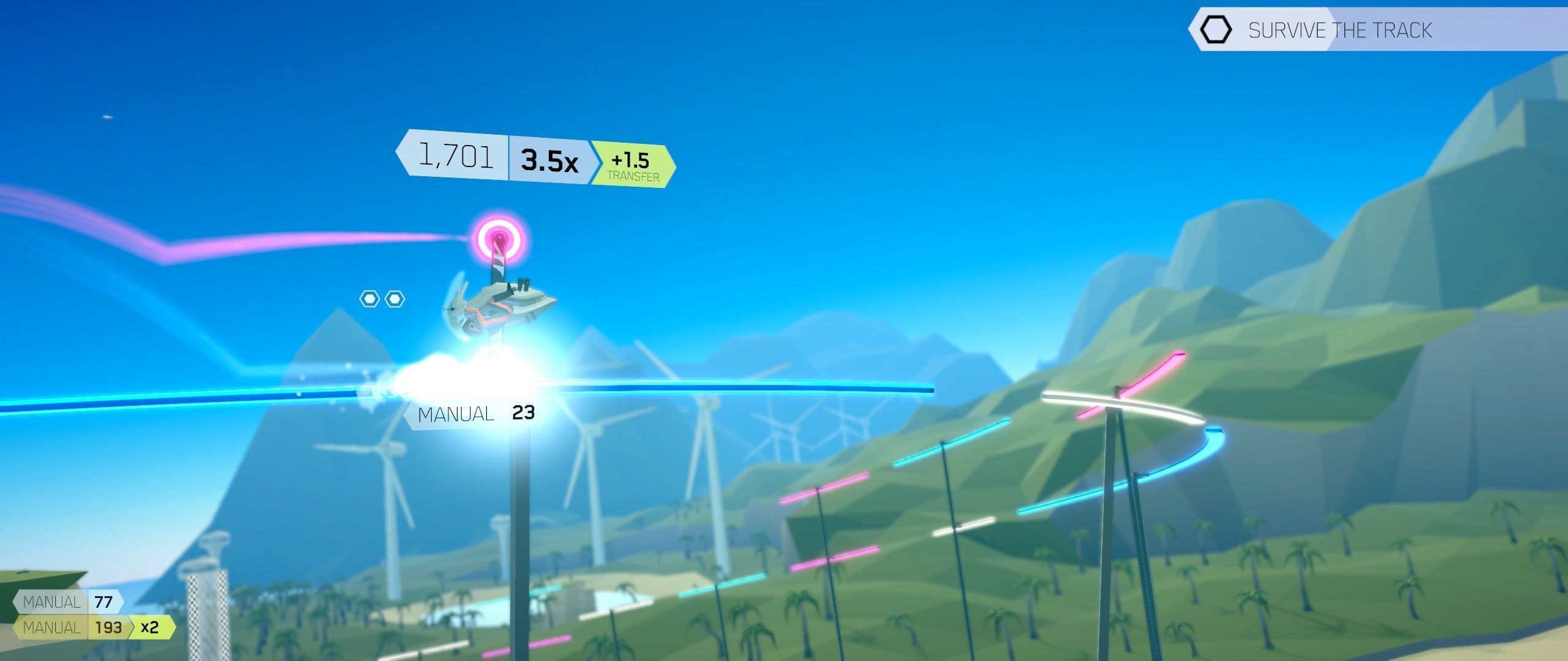 A todas estas acrobacias tenemos que sumarle los potenciadores y modificadores que encontramos en los escenarios. Encontraremos objetos que nos propulsan, o que cambian los colores de las ruedas o los raíles, obligándonos a reaccionar rápido. Es un juego diseñado para repetir las fases varias veces, al estilo Trials. Tenemos que aprendernos parcialmente los circuitos para completarlos, y repetirlos varias veces para conseguir el 100% en cada uno.