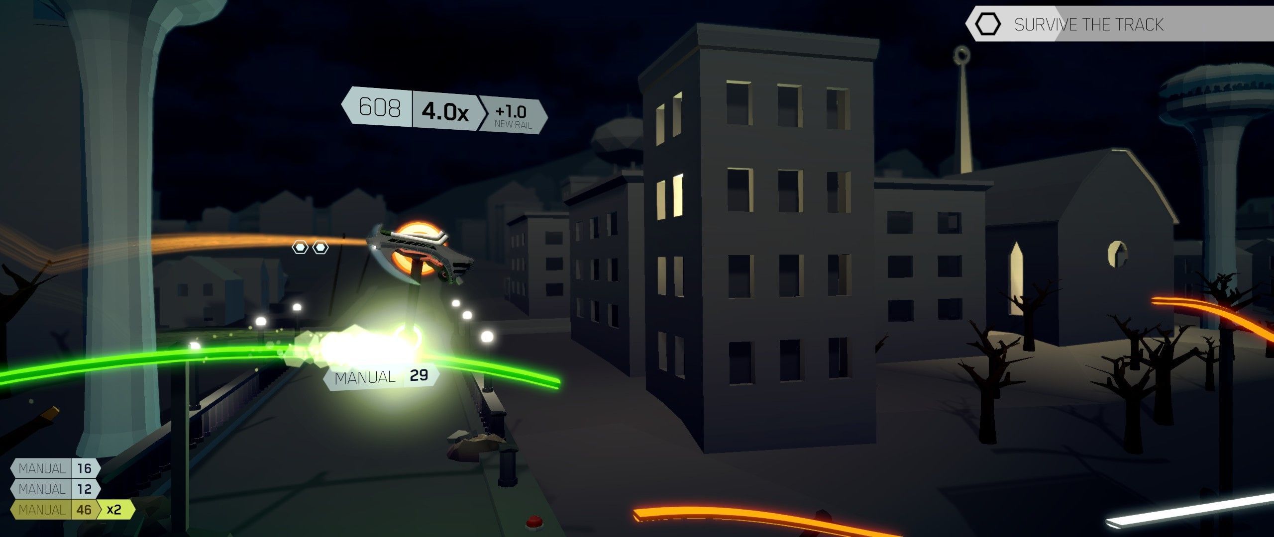 FutureGrind es un sencillísimo pero adictivo título consistente en deslizarnos por unos raíles con una especie de moto futurista. De manera muy simplificada, tenemos que asegurarnos de que cada rueda de nuestra moto toque sólo los raíles del mismo color. Sobra decir que las cosas se van a ir complicando para poner a prueba nuestra habilidad y nuestros reflejos y, por supuesto, dar profundidad a esta experiencia arcade.