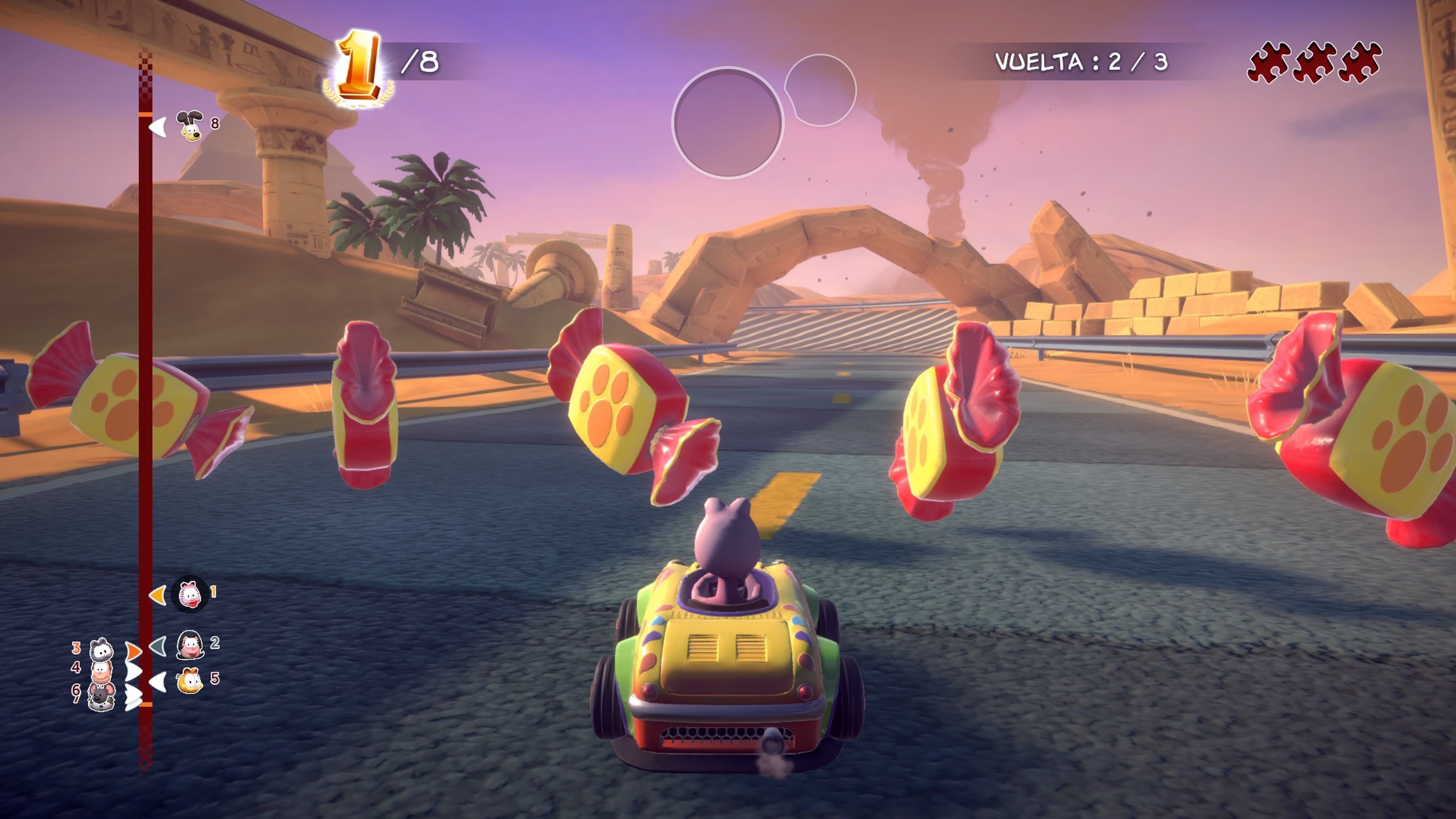 Y cada uno de estos tipos (y animales) posee sus propias características (velocidad, aceleración y manejo), detalle que siempre se agradece. Y además de esto, es posible tanto escoger el kart que deseamos pilotar como aquellos complementos que deseamos plantar a dichos personajes (gafas, gorros, etc.), los cuales podemos ir consiguiendo a medida que competimos.