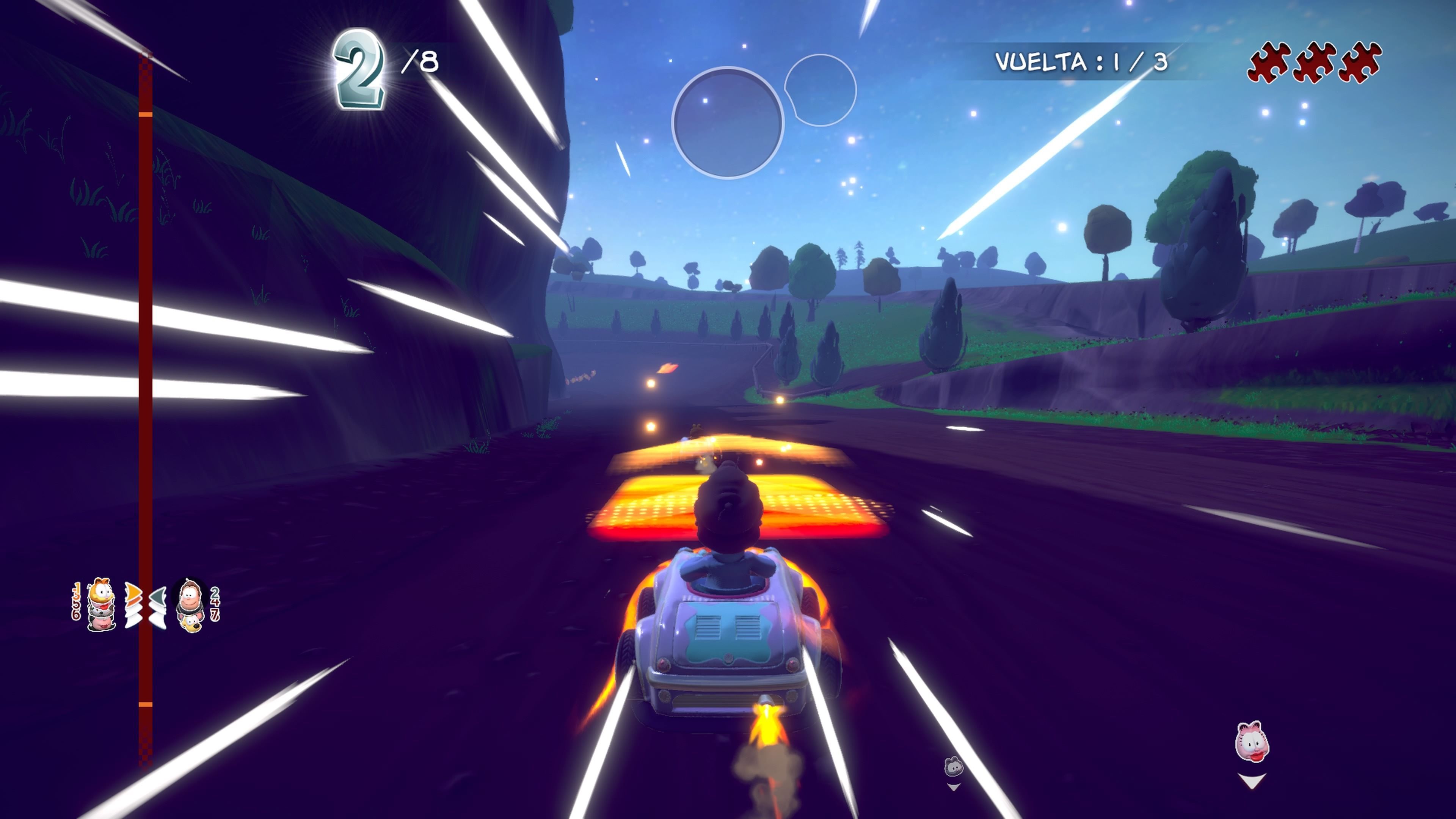 Todo esto suena bastante bien pero, por desgracia, se trunca completamente cuando nos subimos al kart correspondiente y saltamos a las pistas. ¿Y por qué? Pues porque el desarrollo de las carreras es de todo menos interesante y entretenido, y durante las mismas es posible advertir un cúmulo de errores importantes que echan por tierra gran parte de la diversión que podría haber ofrecido el juego con algo más de cierto en su ejecución. Para empezar el control de los vehículos, aunque es muy sencillo, no ha sido del todo bien implementado, algo que sale a relucir de manera muy notoria cuando nos animamos a derrapar en las curvas para cargar el turbo correspondiente, acción que ha sido integrada de manera bastante mejorable.