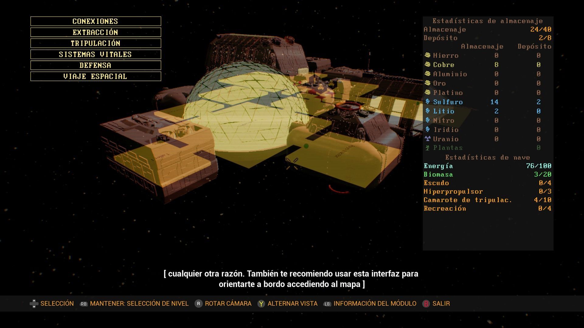 Nuestro primer objetivo es construir una nave de exploración, contando para ello con un completo y bien diseñado menú modular que nos permite añadir todo tipo de estancias y pasillos. Entre las zonas disponibles encontramos refinerías, depósitos de materiales, armerías, invernaderos o rayos de extracción. Todas ellas son muy importantes y su correcta utilización nos permite mantener estable la nave e ir ampliando las instalaciones.