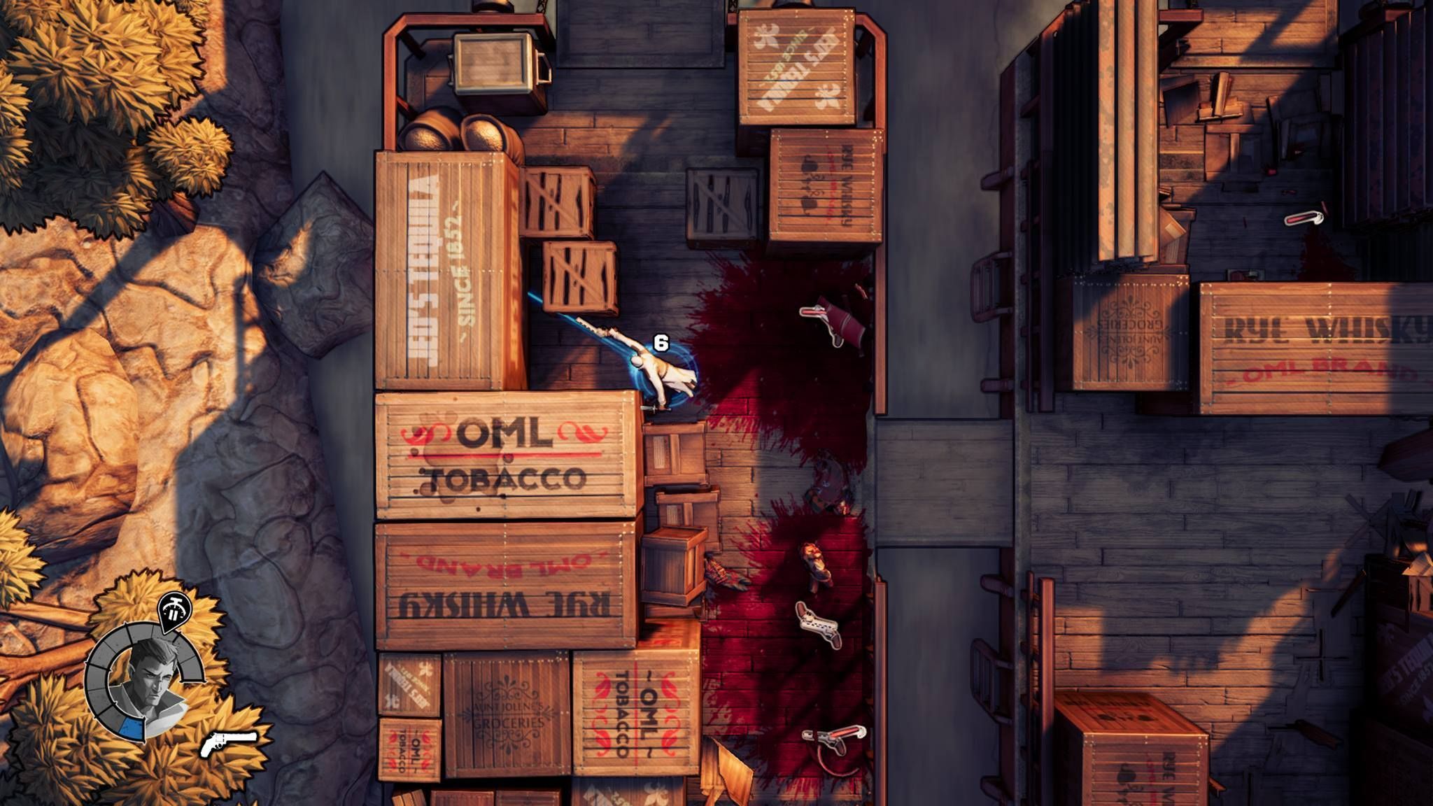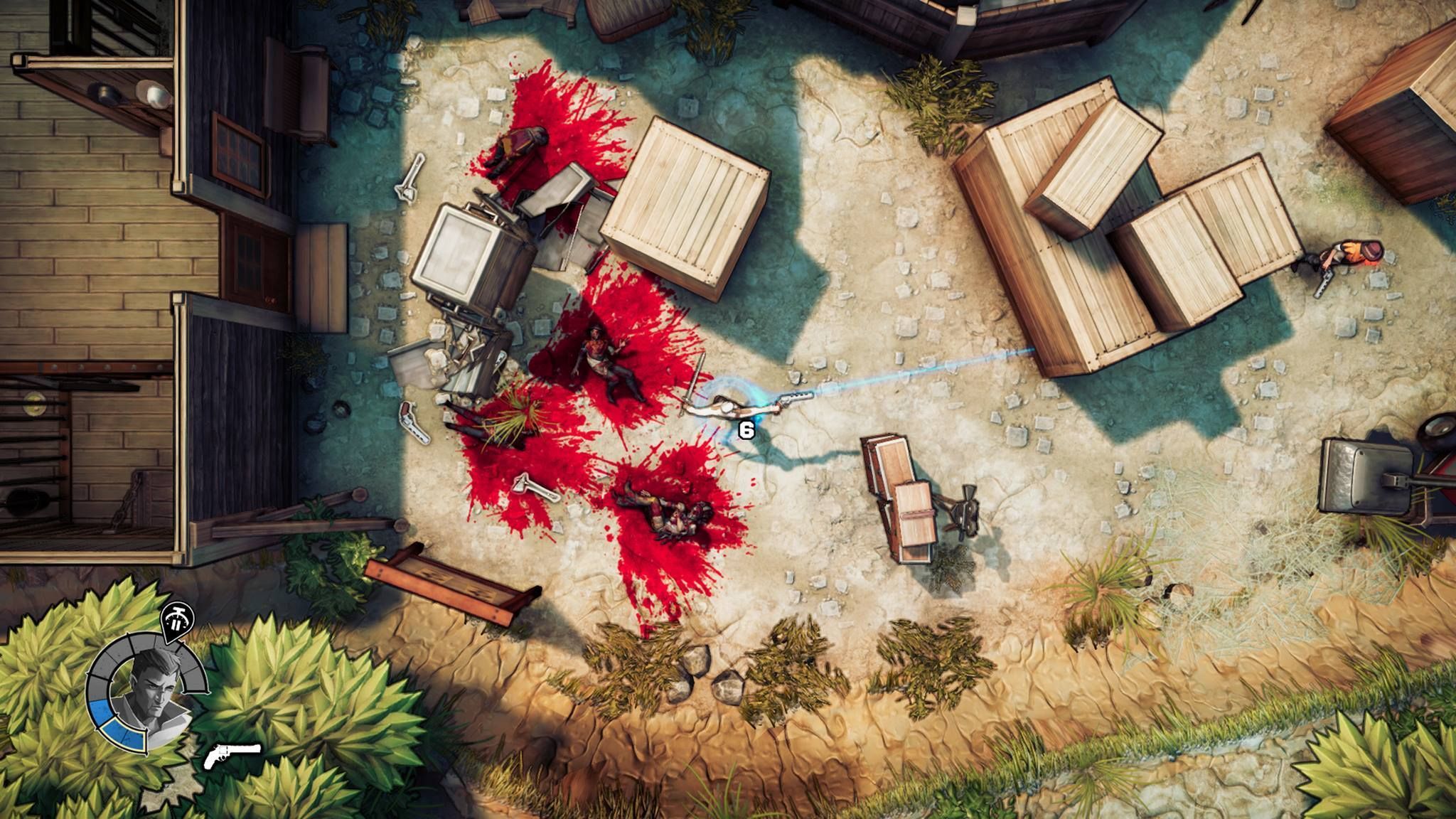 God's Trigger es un juego sangriento, donde dejaremos un reguero de sangre a nuestro paso. La estética colorida y sombreado cel shading para los personajes impide que sea un juego desagradable o excesivamente gore, pero no por ello deja de ser violento.