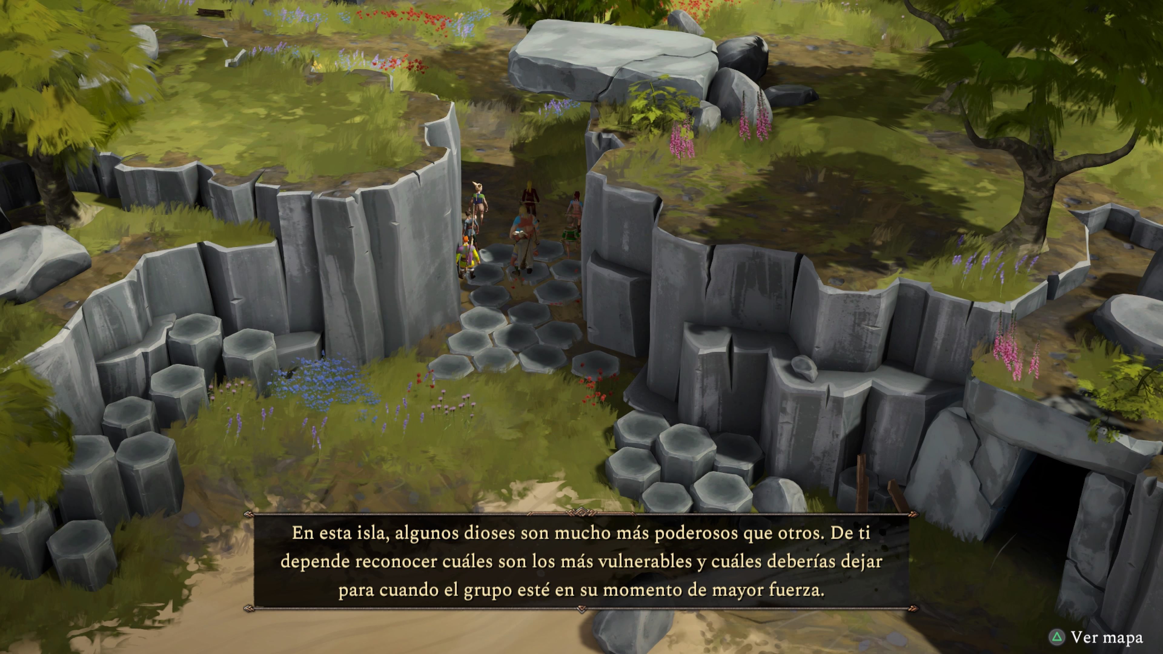 Lo procedimental también afecta a la dificultad, claro. La disposición de la isla es inmutable, pero la colocación de las diez mazmorras con sus respectivos dioses sí va variando, así como la dificultad de cada una de ellas. En cada run hay varias mazmorras fáciles, otras tantas con un reto intermedio y otras difíciles, pero nunca sabes cuál es cuál hasta que no has puesto un pie en ellas; la dificultad aquí, por cierto, se mide en la cantidad de enemigos, en su salud y en el daño que hacen, pero los escenarios en sí mismos son inmutables. Esto pretende generar una tensión provocada por el hecho de que, si un guerrero perece dentro, no puedes recuperarlo hasta que superes la mazmorra con otro personaje; con mala suerte eligiendo el orden en el que enfrentarse a las deidades uno podría quedarse con su pequeño ejército diezmado muy pronto.