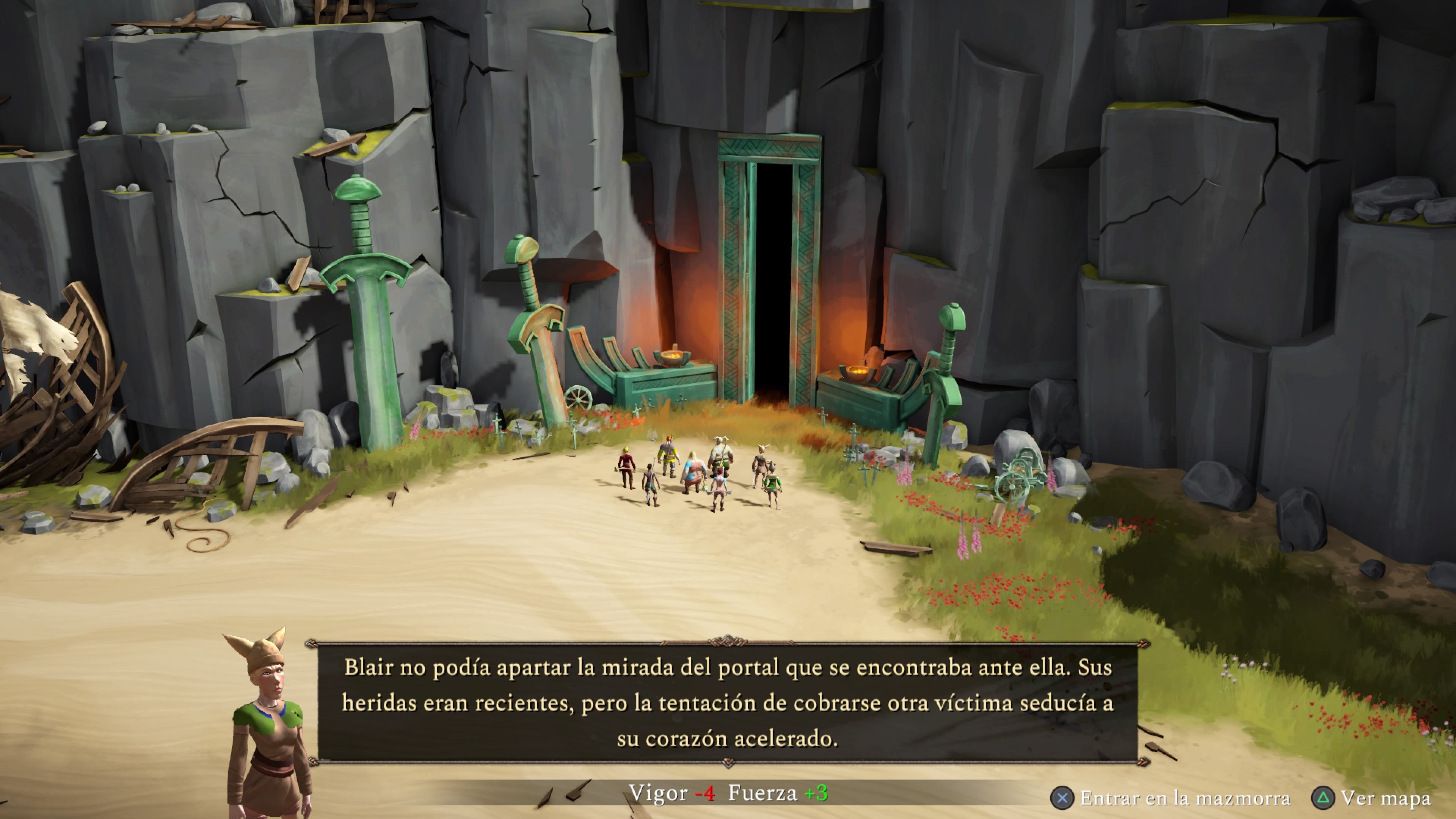 Los tres guerreros esperaban con impaciencia frente al gran portal de piedra. Tras un tiempo, la columna que bloqueaba la entrada se abrió. Pero nadie salía del umbral. Uno de ellos temblaba de miedo, otro se lamentaba ante lo acontecido, pero el tercero se armó de valor para vengar al amigo que, quizá, acababa de perder. Volvió a pasar otro buen rato, y de nuevo, el umbral. Nadie apareció. Otra vez. Con la lanza en mano y cogiendo los pocos recursos restantes, el más valiente se lanzó ante lo desconocido para dar caza al temible dios e intentar rescatar a sus compañeros. Aún temblando, el único que quedaba esperó a que el portal se volviera a abrir, pero esta vez salieron, uno detrás de otro, los siete amigos con los que había emprendido este peligroso viaje. Pertrechados con nuevas armas, habilidades y el ánimo de la victoria, reunidos, se echaron al camino para enfrentarse a la siguiente deidad.