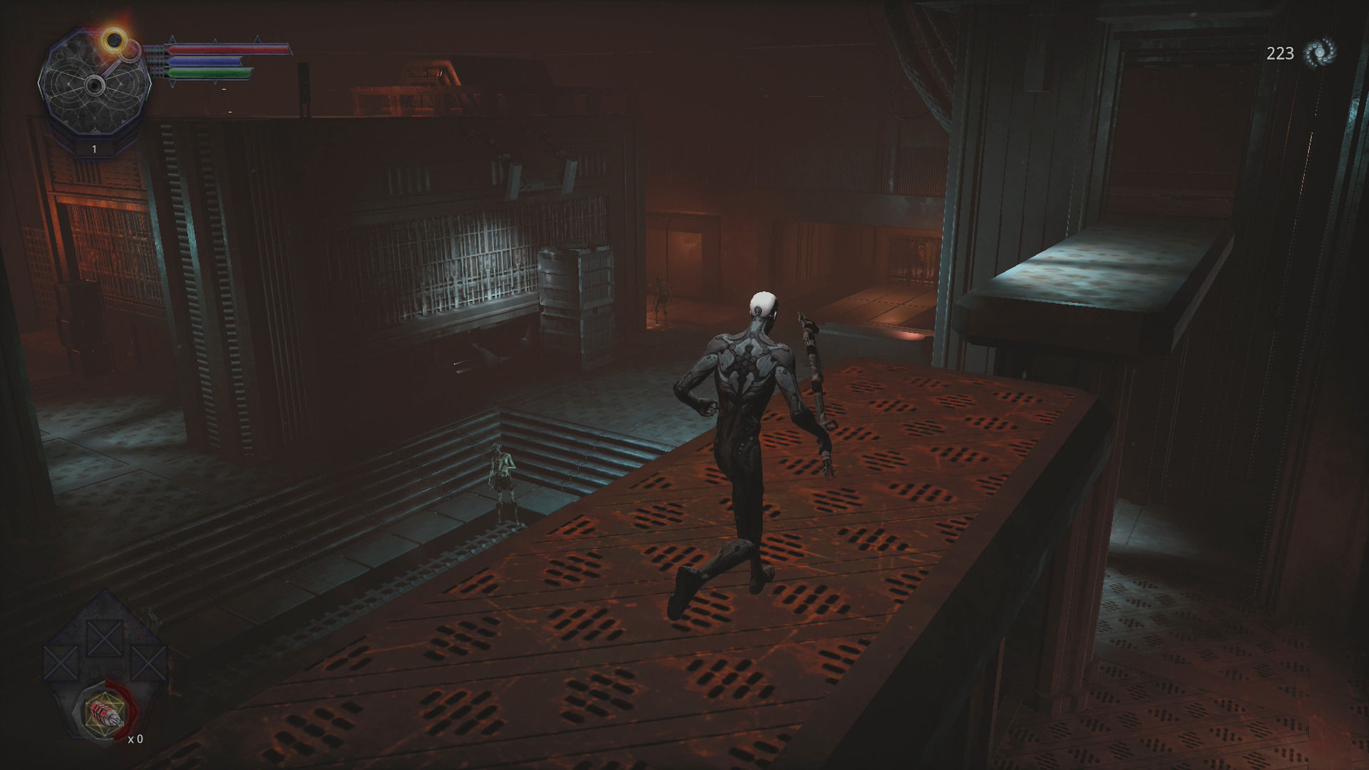 Muchos imitadores de los Souls se centran sobre todo en el combate y descuidan otros apartados, y esto es un poco lo que sucede con Hellpoint. Si hablamos del sistema de lucha tenemos un juego decente, cómo no, ya que intenta fusilar el control de FromSoftware: ataque rápido, otro lento y más pesado, giro para evadirse, patada para romper defensas enemigas, etc. Si has jugado al género no necesitarás ni los tutoriales de control porque es tan intuitivo como esperarías, con sus mecánicas de mejora y reparación de armas, distintos estilos según su estilo, escudos, barra de resistencia que se agota por acciones… Prácticamente la única aportación en la jugabilidad es que tenemos un botón de salto para ciertos tramos con un poco de plataformeo –saltar fosas o cajas, pero no es que sea muy satisfactorio-. Y sí, también hay un sustituto a las almas, un recurso que debemos recuperar tras la muerte, hay un equivalente a las hogueras, unas inyecciones curativas –en este caso se recargan con los combates-, jefes detrás de una "niebla" –y muchos con un parecido sospechoso a oponentes que ya conocíamos de otros juegos-…