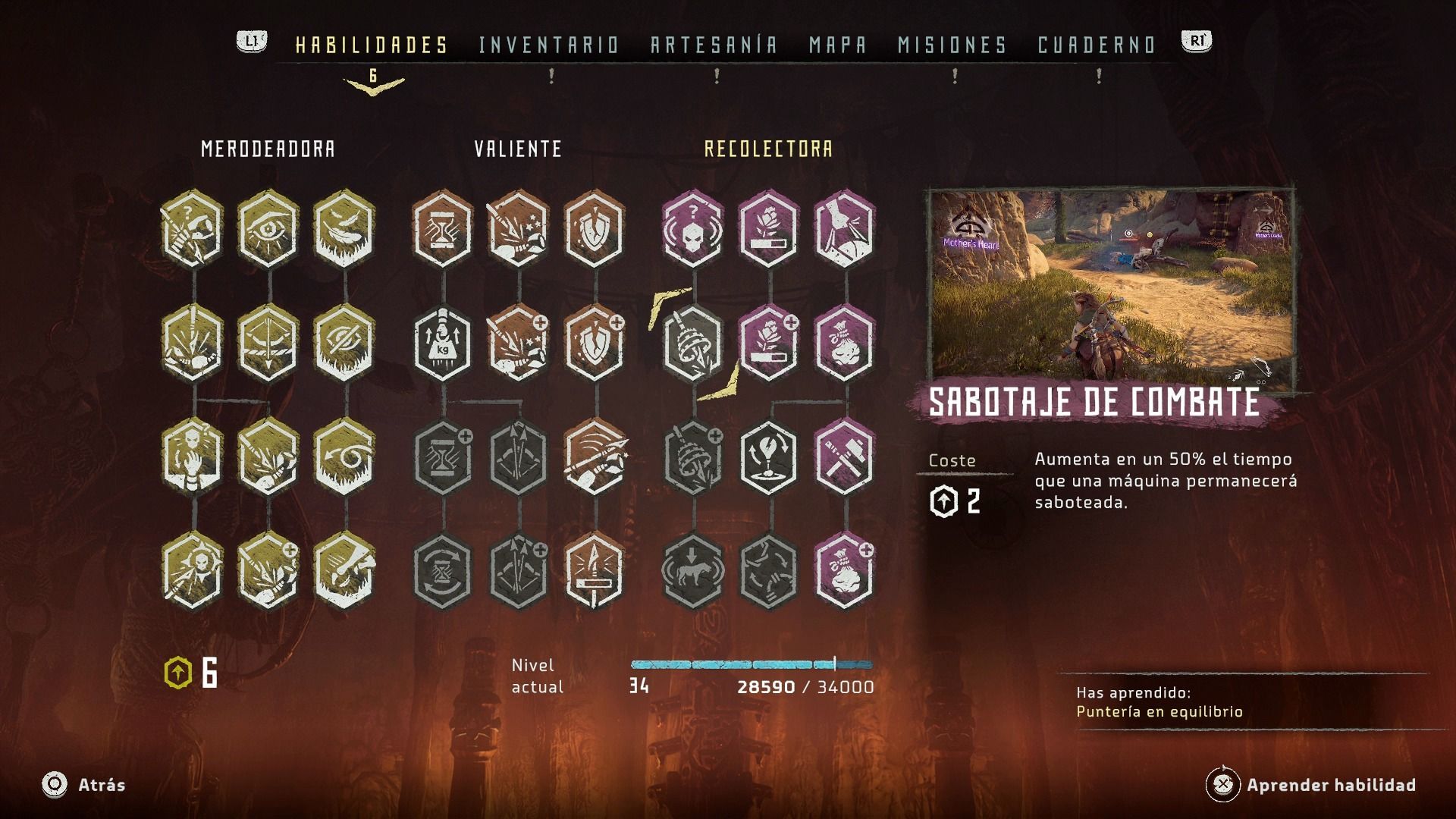 Por ejemplo, además de disparar flechas, podemos poner distintos tipos de trampas en el suelo, ya que el Foco nos permite ver la ruta de los enemigos, e incluso podemos amarrar a las máquinas al suelo mediante un disparador de cuerdas. A la hora de disparar a los puntos débiles de los enemigos, algo que no es fácil porque no paran de moverse, podemos usar una habilidad que ralentiza al tiempo y que nos permite apuntar con cierta comodidad, aunque como otras ayudas tenemos que primero desbloquearla en los árboles de habilidades, que nos dan acceso a acciones realmente útiles.