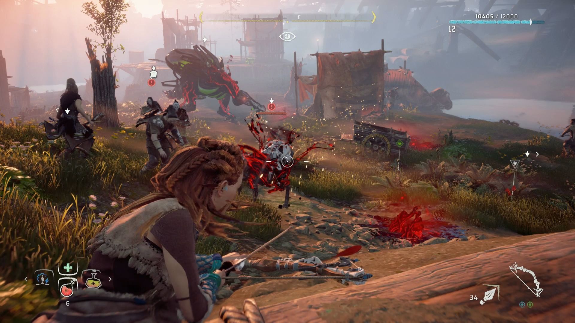 En líneas general la acción de Horizon ofrece muchas de posibilidades, y además se mantiene fresca hasta el final de la aventura, porque siempre van apareciendo nuevos tipos de enemigos (casi 30 tipos de máquinas diferentes), que cada vez son más grandes y sorprendentes, y con comportamientos muy diferentes. El trabajo que ha hecho Guerrilla a la hora de diseñar estas máquinas es magnífico, y es increíble la cantidad de detalles que tienen sus modelados, o sus magníficas animaciones.
