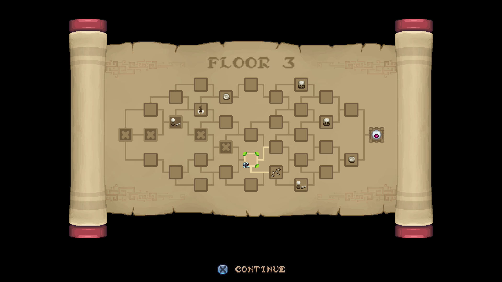 Una vez entramos en faena la cosa cambia bastante. De hecho, el juego se parecería a Binding of Isaac… si no fuera porque realmente se parece más a un juego más antiguo como es Robotron 2084 (el padre de los juegos de disparo de doble stick). Al inicio de cada piso vemos un pequeño mapa en el que nosotros estamos en un extremo, y en el otro se encuentra el monstruo que guarda el avance al siguiente piso, y un montón de habitaciones cuyo contenido aún no conocemos. La primera habitación, de hecho, ya hace el papel de fantástico tutorial, pues podremos practicar el disparo de nuestras hachas contra unas vasijas que o nos dan dinero o explotan, y donde tendremos tres posibilidades a elegir (arriba, abajo o al centro).