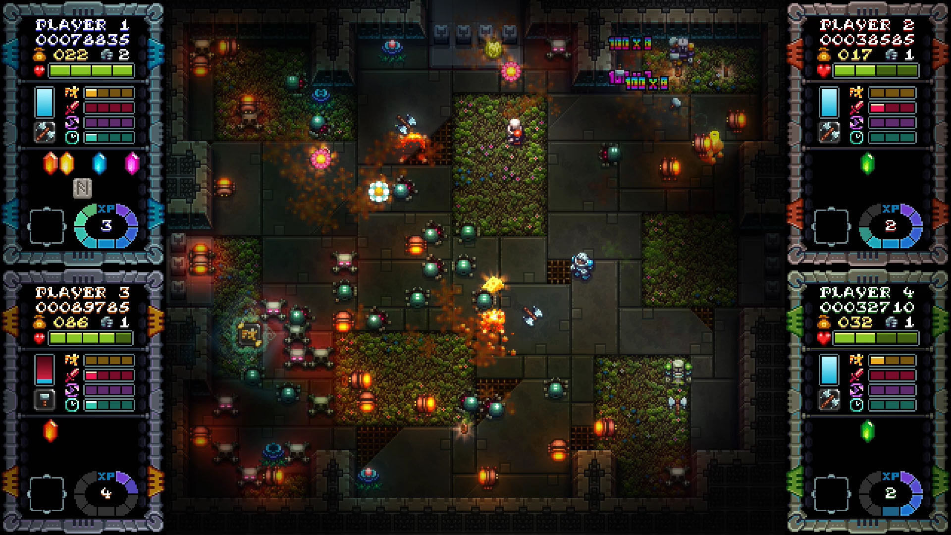 Como datos extra comentar que Iron Crypticle se puede jugar hasta a 4 jugadores simultáneamente, lo que lo convierte en un verdadero festival de disparos, enemigos y jugadores, y como pequeño fallo decir que el juego permite disparar en 8 posiciones, y esto a veces queda algo extraño, cuando un enemigo no está en una de esas 8 posiciones y no es suficiente con mover el stick derecho para disparar, sino que tendremos que adaptar nuestra posición también para poder dispararles.