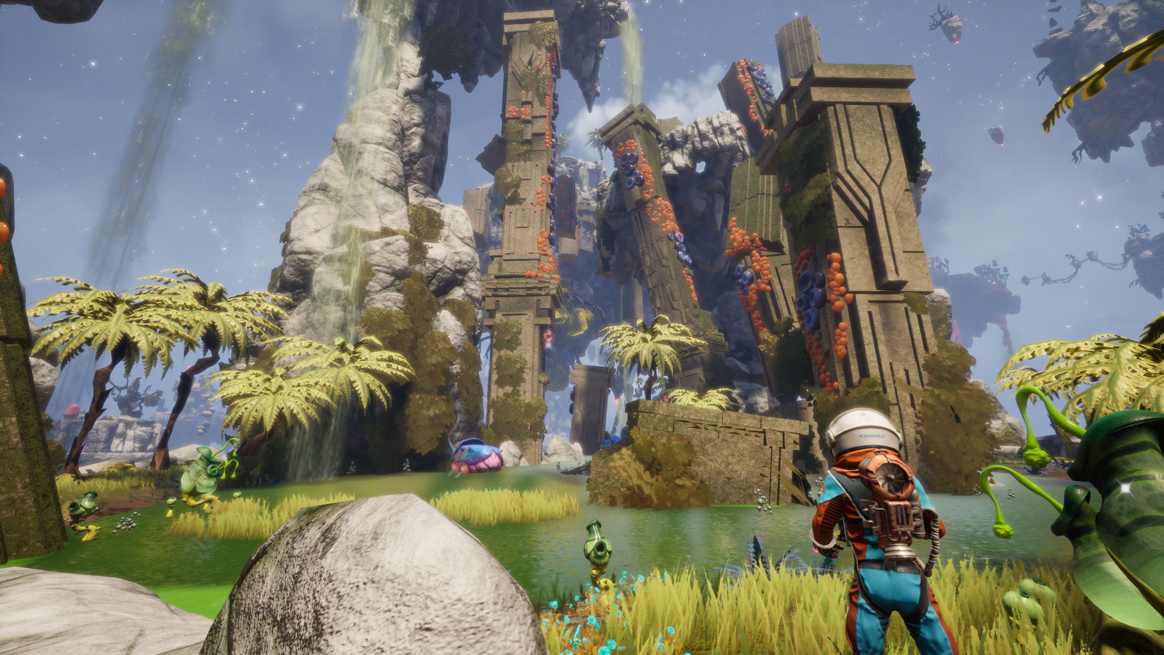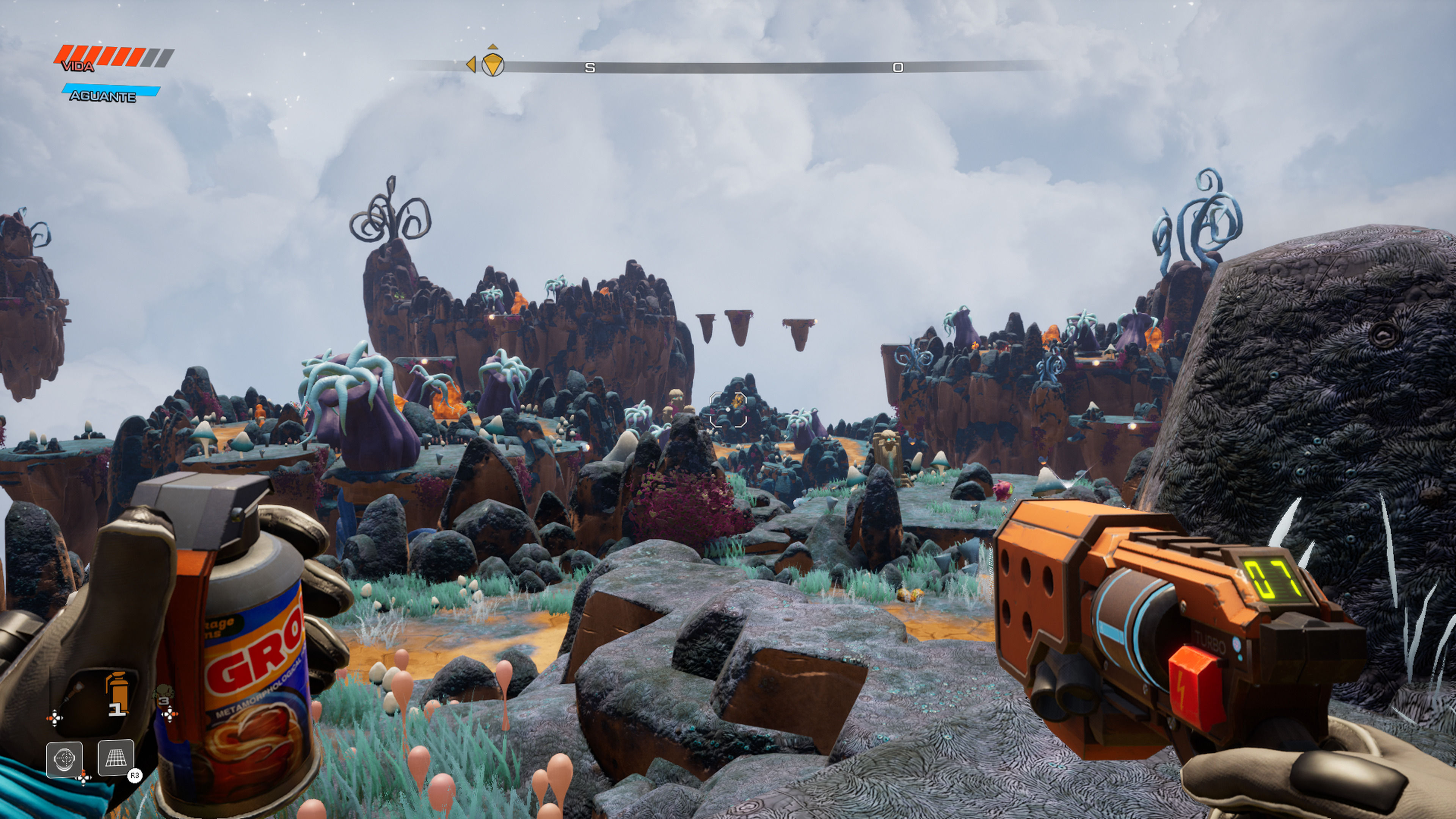 Artísticamente, Journey to a Savage Planet nos ha encantado. En cierto modo recuerda a esos mundos alienígenas de No Man's Sky, pero con la ventaja de estar diseñados a mano, pudiendo de dotar de mayor personalidad cada rincón y a cada criatura. Pero más allá de lo estético, cada escenario es gigantesco, repleto de posibilidades y con un diseño fantástico. Da gusto perderse, investigar y llegar a nuevos lugares, sobre todo por que (casi) siempre suele haber una recompensa. Es un mapa que te anima a explorar, y en el que podemos perdernos durante horas y horas, y extender así la notable duración media del juego. La historia puede completarse unas cinco o seis horas a un ritmo normal, pero creemos que merece la pena explorar e intentar conseguir el 100% para ver el final auténtico.