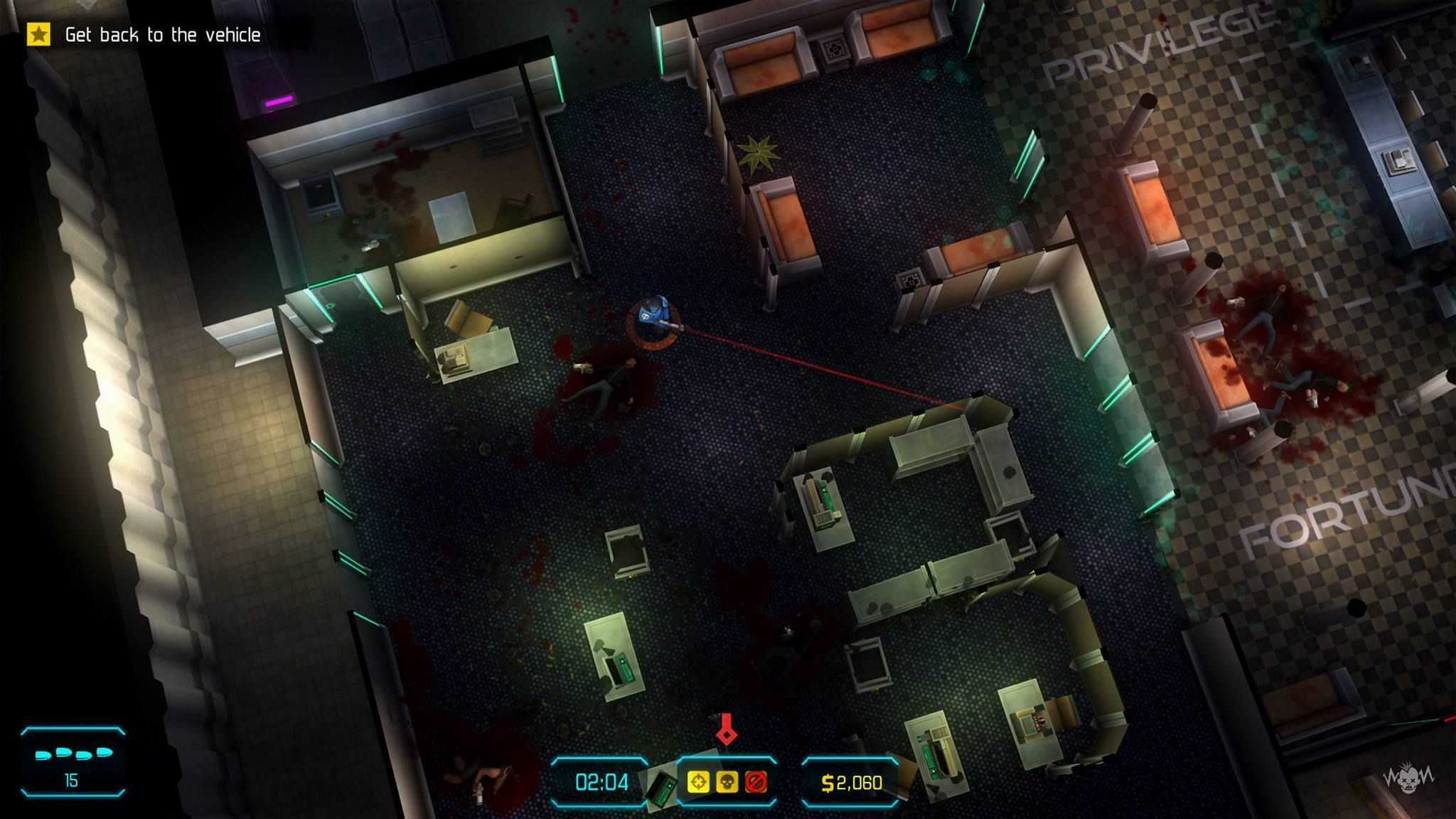 Es interesante ser el primero en actuar: si sorprendes a un enemigo, tus disparos serán más letales. El mapa, por cierto, es interactivo, y al igual que Neon Chrome podrás destruir muros con explosivos para atravesar algunas paredes. Puedes hacerlo para abrir atajos o dar rodeos a zonas que se encuentran bloqueadas –necesitan un pase especial-.