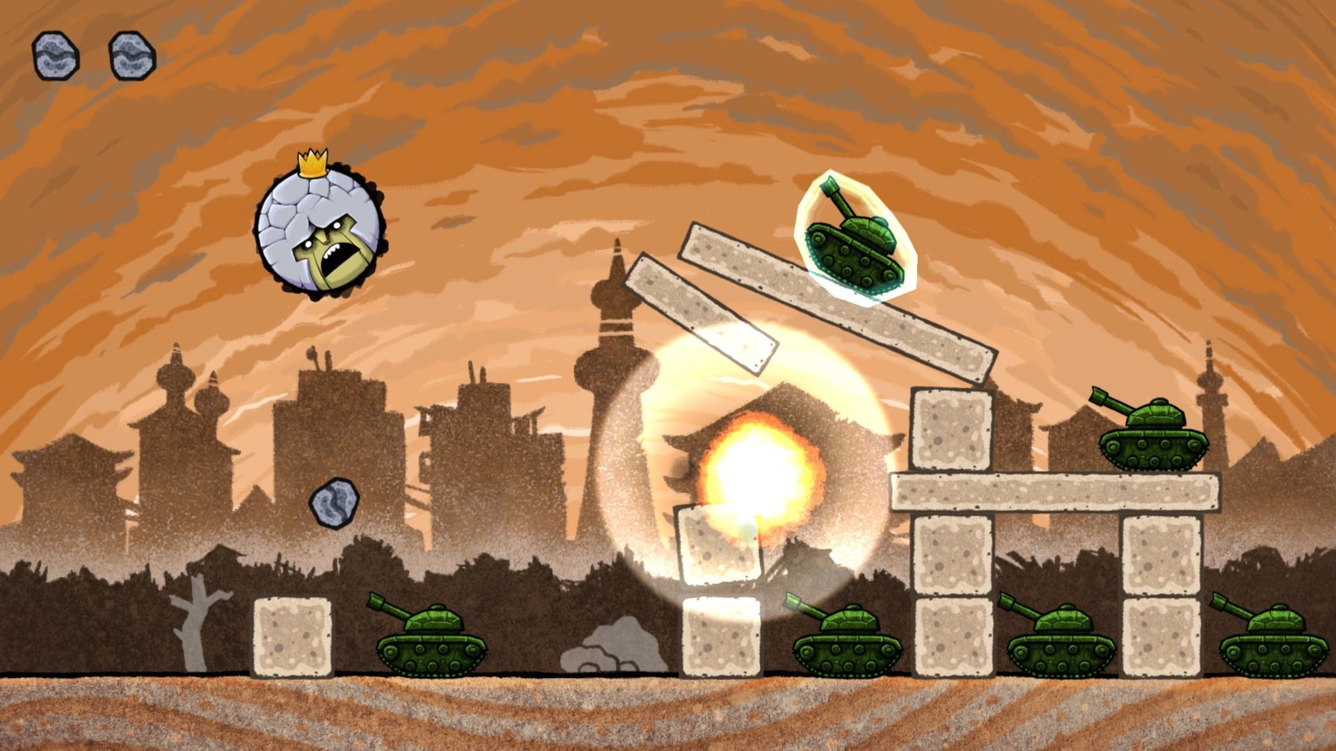 Así como en lo principal nos convence, la jugabilidad, se nota que no es un producto tan pulido como Angry Birds. En primer lugar, la mayoría de fases son idénticas en apariencia, reordenando los enemigos en varias alturas diferentes, pero se nota una falta de frescura. De vez en cuando encontramos sutiles diferencias, tipo helicópteros congelados en hielo –necesitan dos golpes-, los soldados que mueren sin hacer rebotar a las piedras o unas esferas de goma que desvían los impactos, por citar pequeñas novedades que modifican un poco la estrategia, pero no mucho. Algunas de las acciones arriesgadas nos premian con una piedra extra, lo que es una gran ayuda según la complejidad y número de rivales.