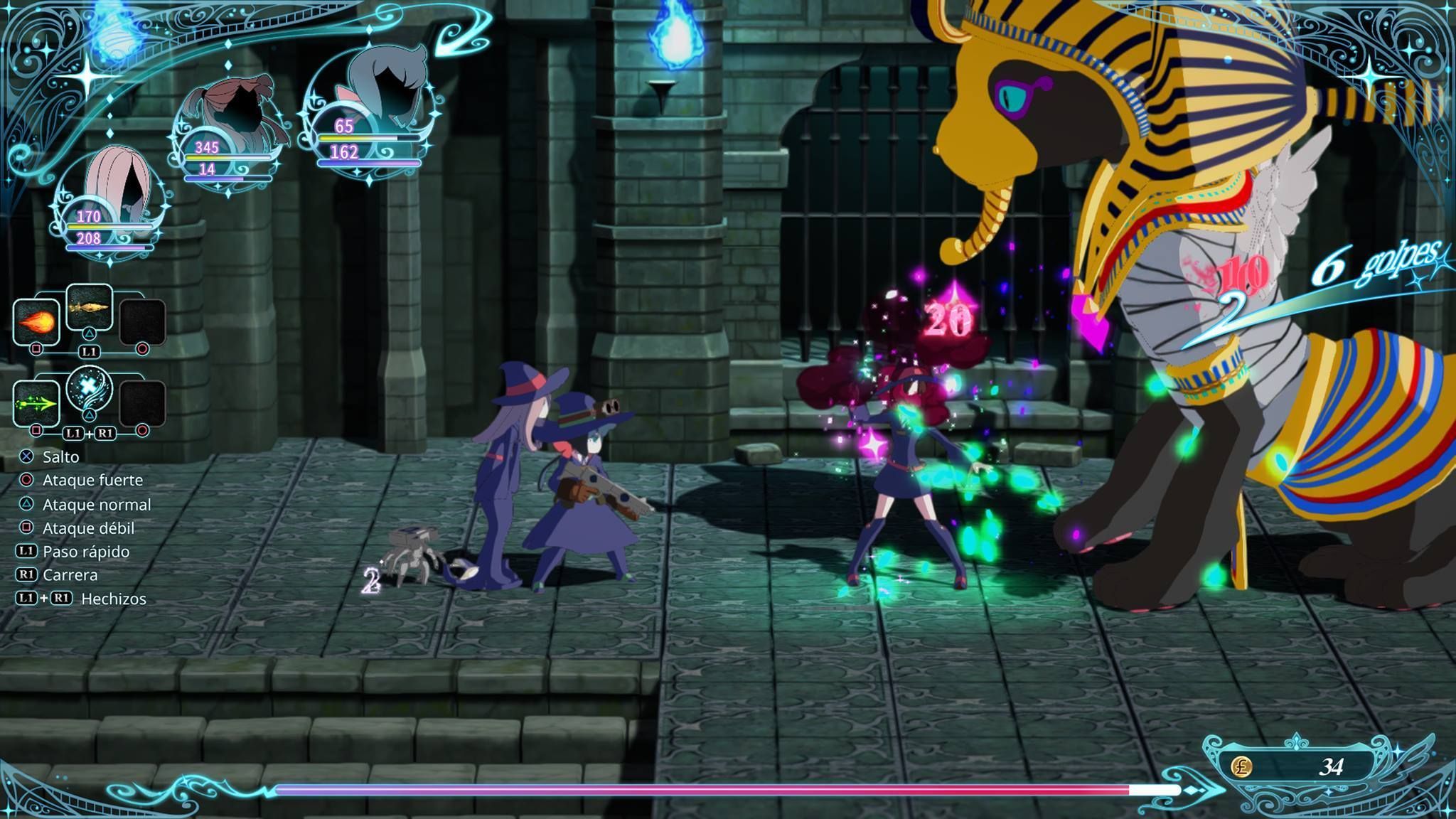 Un ejemplo de lo básico que es el combate lo tenemos con los jefes de historia, imponentes en tamaño sí, pero generalmente funcionan con una estrategia extremadamente simple: son invulnerables a nuestros ataques hasta que golpeas un punto débil, entonces quedan debilitados durante unos instantes, atacas y vuelta a empezar. No hay un combate real que requiera nuestra habilidad, y el reto pierde su gracia cuando descubres cómo funcionan. Los subjefes en cambio son enemigos grandes y con mucha vida con apenas un par de ataques. Definitivamente, Little Witch Academia: Chamber of Time se disfruta más con el tono de comedia de su historia y el carisma de sus personajes que en la parte estrictamente de jugabilidad, que se resuelve casi siempre machacando los botones de acción.