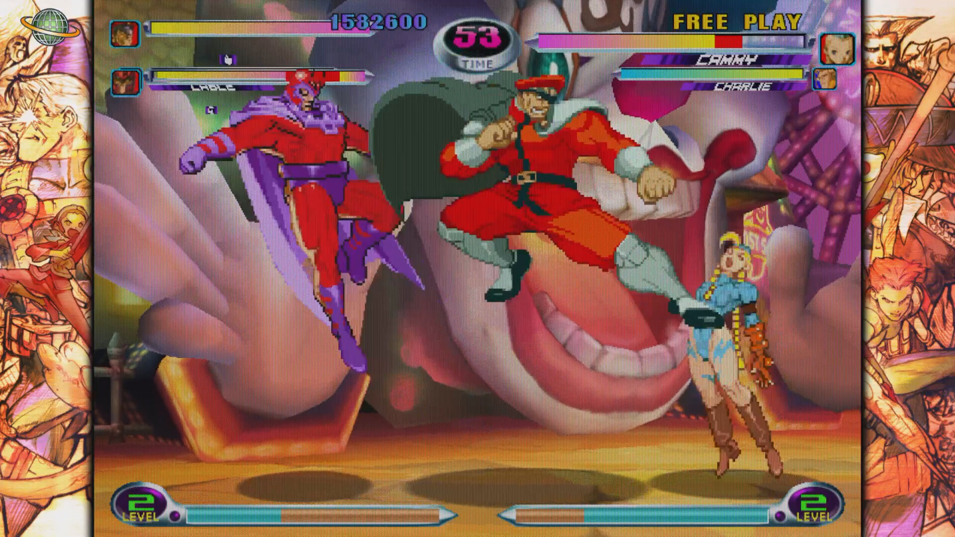 X-Men vs. Street Fighter (1996) fue el juego que comenzó a enfrentar plantillas de Marvel –en este caso limitada a los X-Men- y Capcom –sólo Street Fighter-. De nuevo se inspiró en el gameplay de Street Fighter y la movilidad de anteriores títulos -X-Men: Children of the Atom y Marvel Super Heroes- pero con la opción de seleccionar dos personajes intercambiables. Un modo tag que permitía formar parejas entre tus favoritos de los dos universos: Sabretooth y Nash, Rogue y Chun-Li, Magneto y Bison… Para equilibrar la balanza entre las habilidades de unos y otros, los luchadores de Street Fighter incrementaron la espectacularidad de sus poderes clásicos.