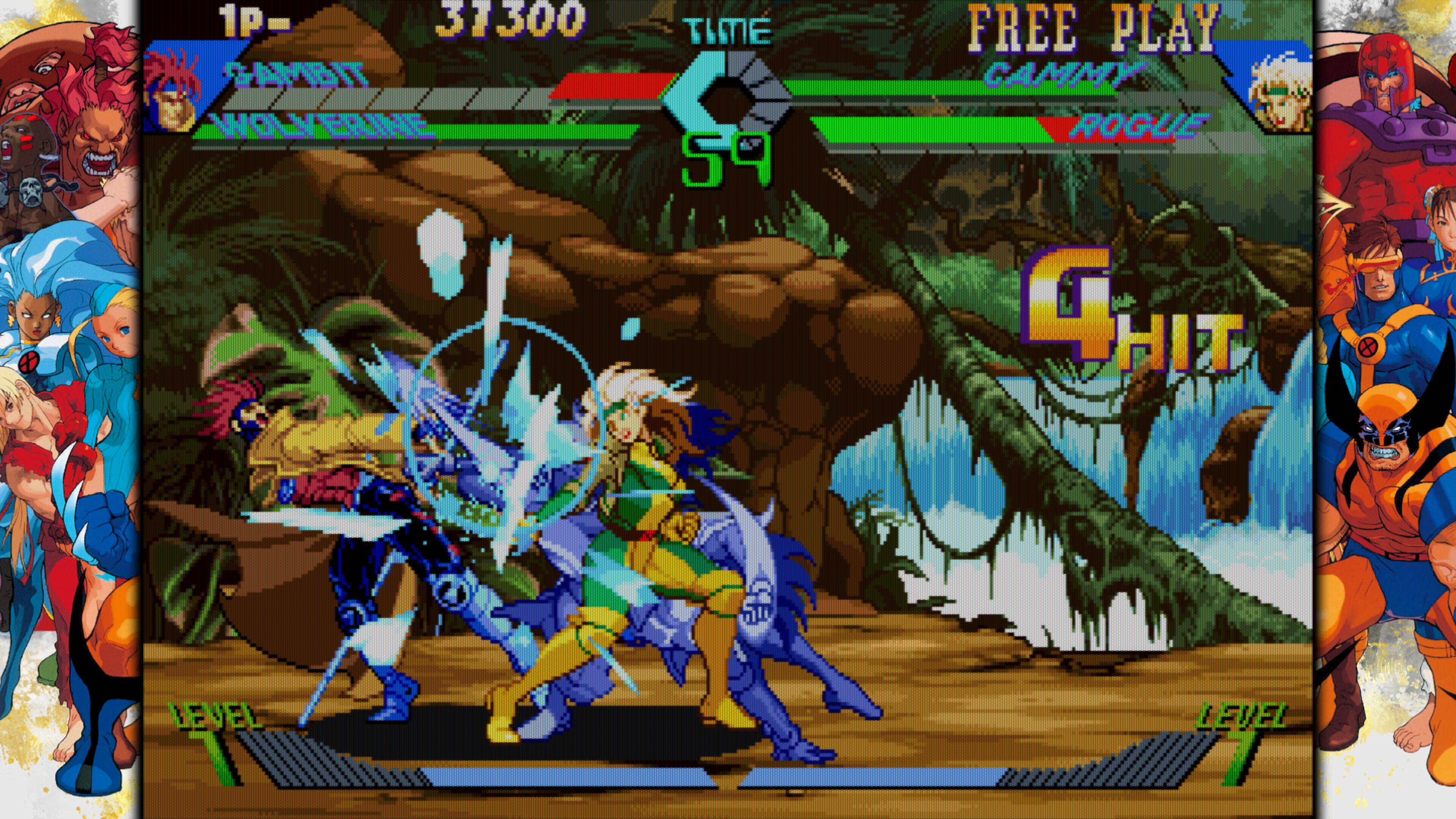 X-Men: Children of the Atom (1994) marcó el inicio de esta saga de lucha que luego evolucionaría ampliando las plantillas a más licencias. Aquí se optó por centrarlo exclusivamente en X-Men, que por entonces tenía mucho tirón por X-Men: The Animated Series –estrenada en 1992 y con la que comparte actores de voz para los personajes-. Es un 1v1 basado lógicamente en Street Fighter 2 y Darkstalkers pero con un sistema de combos que permitía más creatividad en el aire y los escenarios con diferentes pisos. Por supuesto, tenía el encanto de jugar con Wolverine, Tormenta o Cíclope, cada uno con sus habilidades más reconocibles, así que su plantel no necesitaba presentación frente a los Street Fighter o Mortal Kombat: cualquiera que se pasease por los recreativos reconocía a estos luchadores.