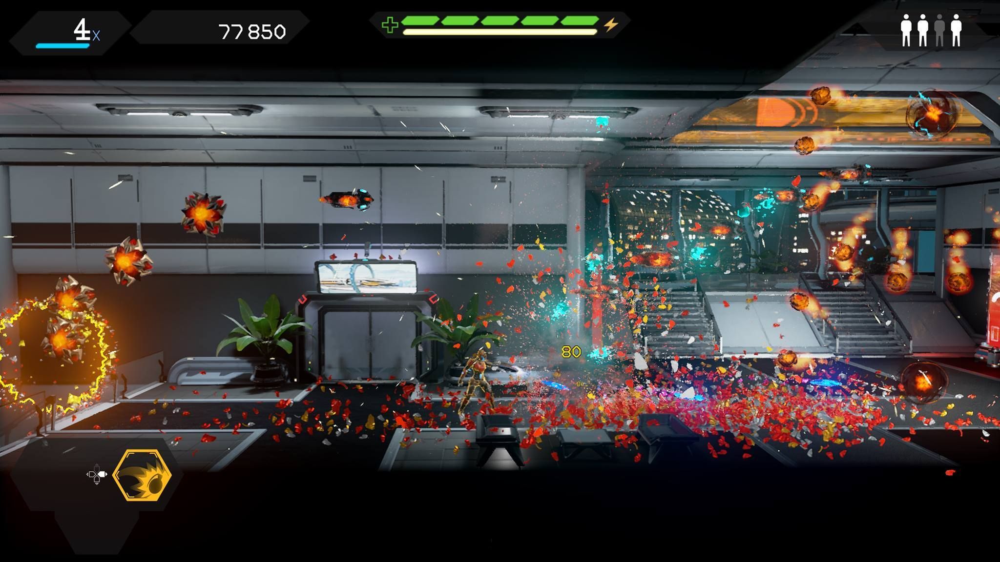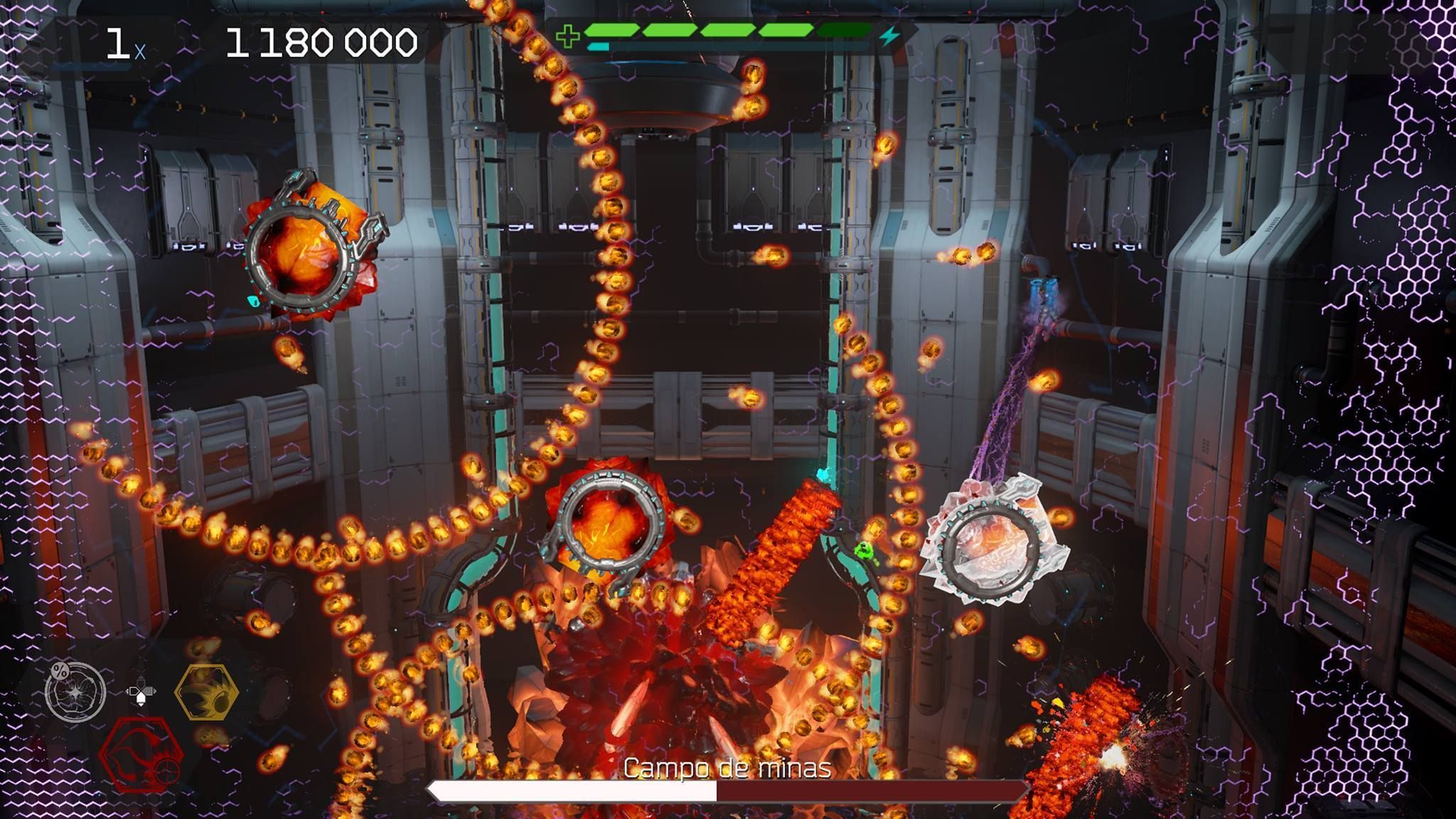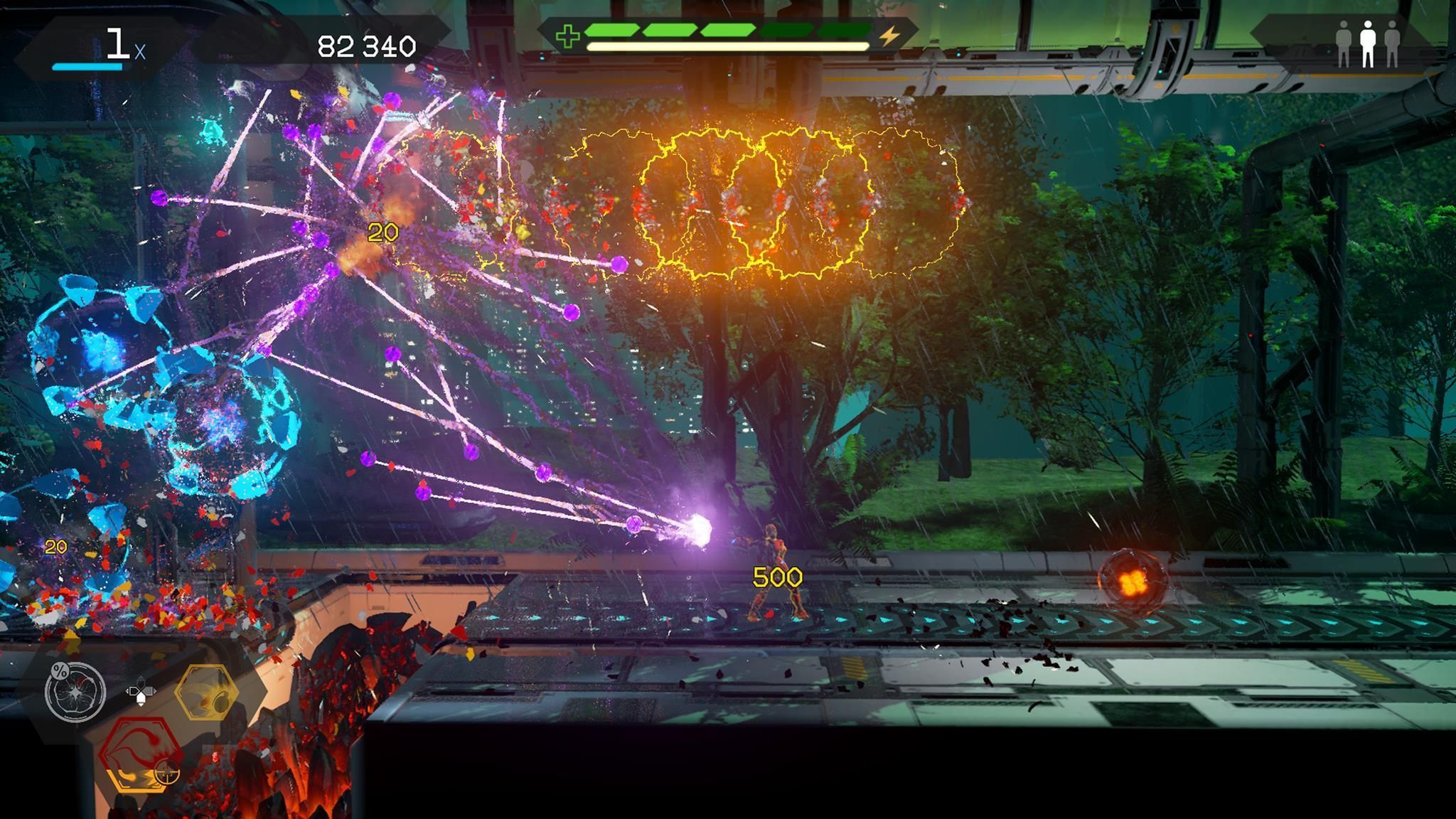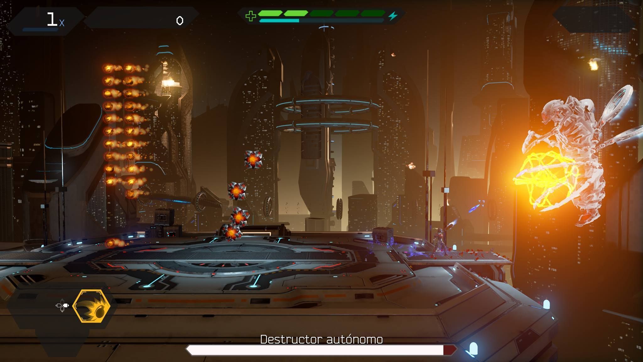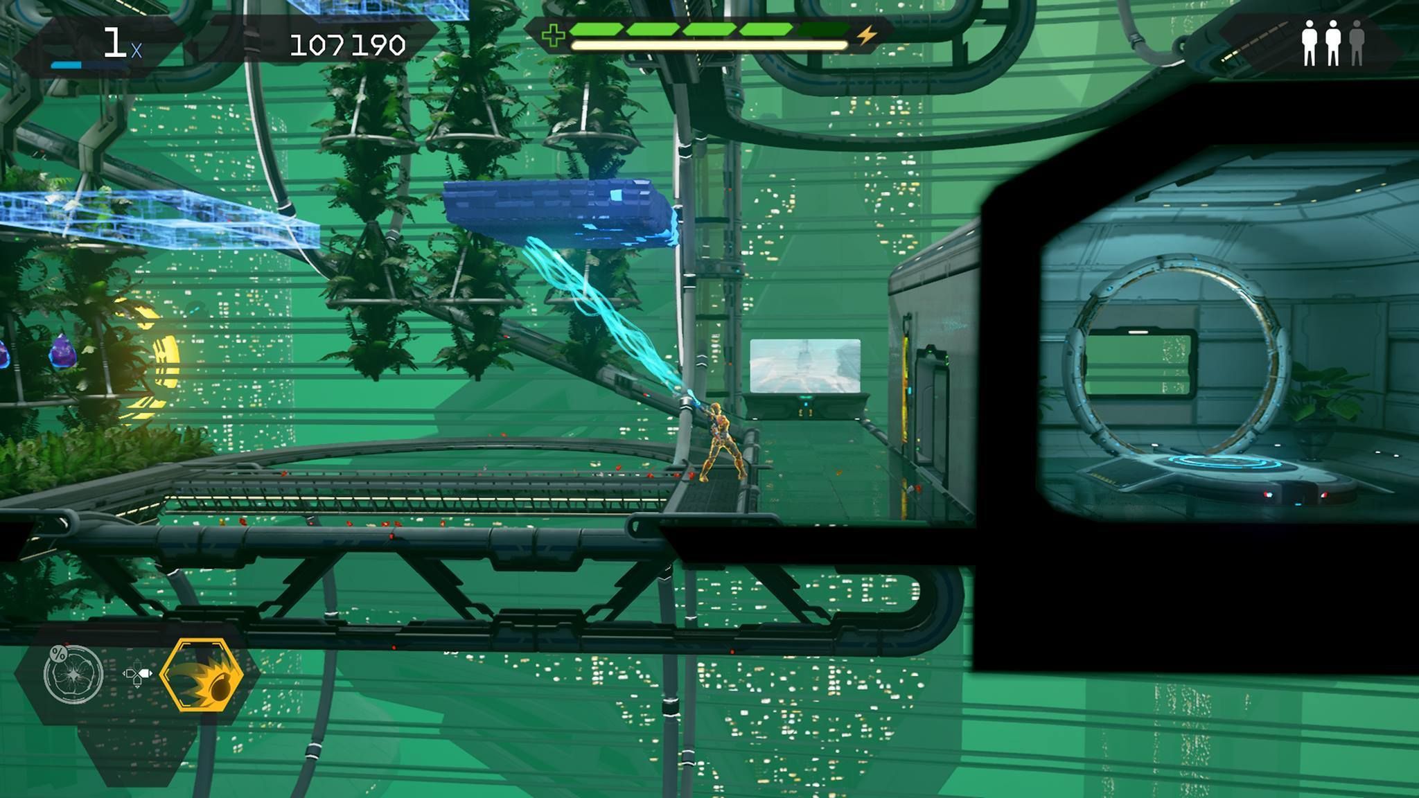 Entre estos factores a tener en cuenta para mejorar la puntuación tenemos el rescate de humanos. Hemos dicho que el recorrido es lineal y así es, pero de vez en cuando encontrarás una pequeña bifurcación o sala secreta con un civil encerrado en un cristal de materia. Aunque no será difícil dar con la mayoría –la propia interfaz te avisa de su proximidad- es posible perder alguno.
