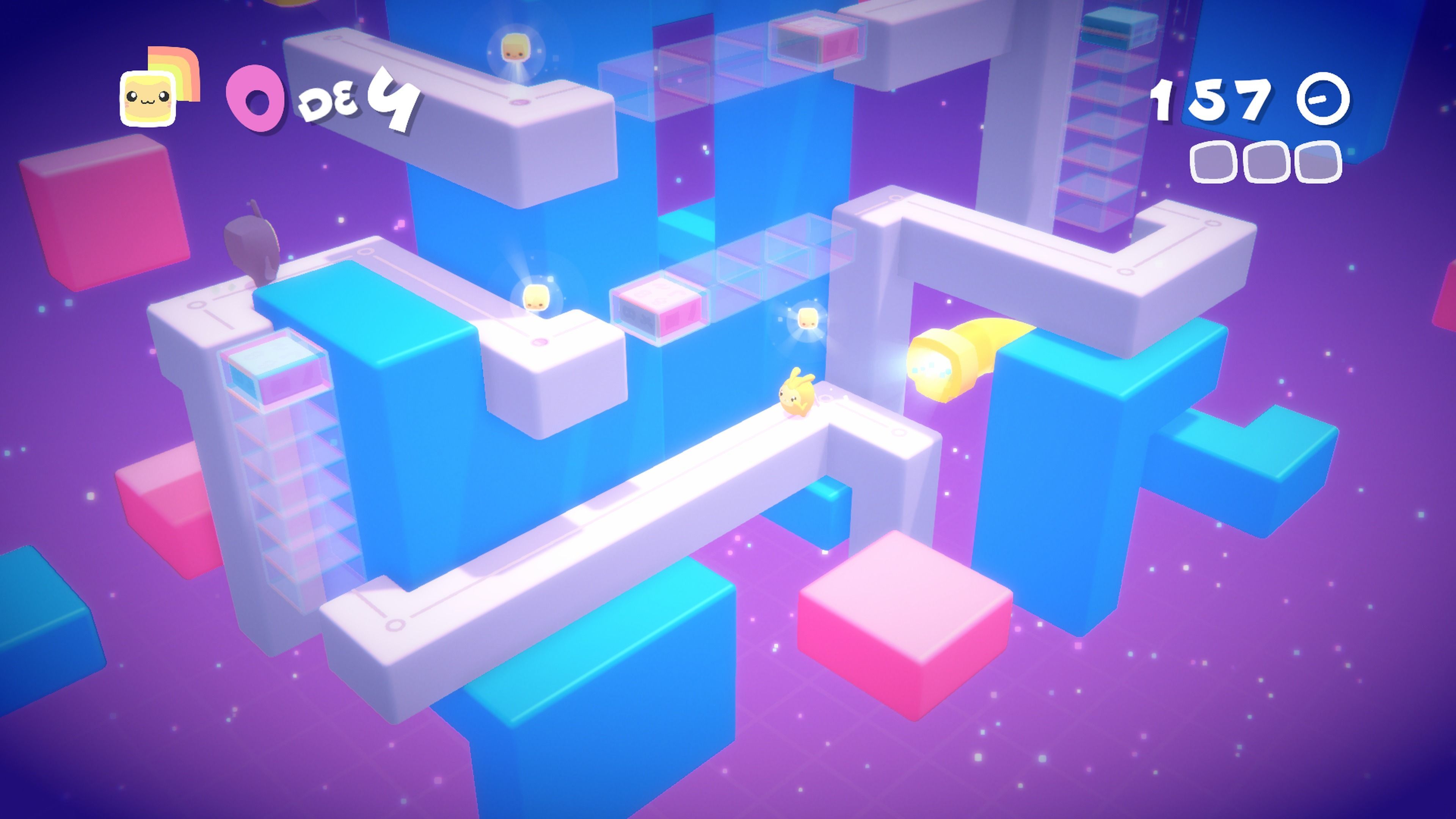 La dificultad nunca es demasiado alta, pero digamos que apuesta por un acercamiento nintendero a ella. Pasar al siguiente nivel es facilísimo, ya que tan sólo tenemos que rescatar a dos Melbits. Hacer el 100% de cada nivel es bastante más desafiante. Hay saltos que requieren precisión, momentos en los que tendremos que usar los obstáculos en nuestro favor y algunas situaciones que nos harán pensar.