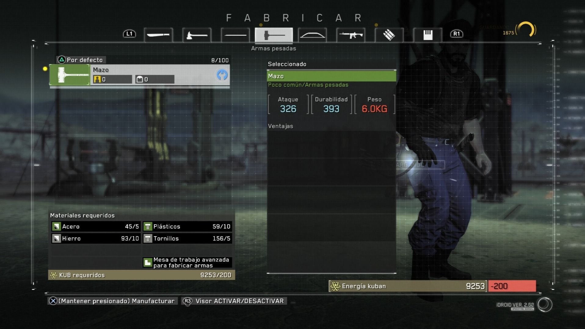 Si nos centramos en el desarrollo del equipo, Metal Gear Survive nos permite reparar nuestras armas, reforzarlas para mejorar sus estadísticas y crear nuevas, necesitando para ello los correspondientes planos de diseño. Cualquier creación también requerirá de una serie de materiales, por lo que será fundamental recopilar todo tipo de materias primas. En este sentido, el peso que podremos portar será limitado, aunque en la base dispondremos de un depósito para aligerar la carga.