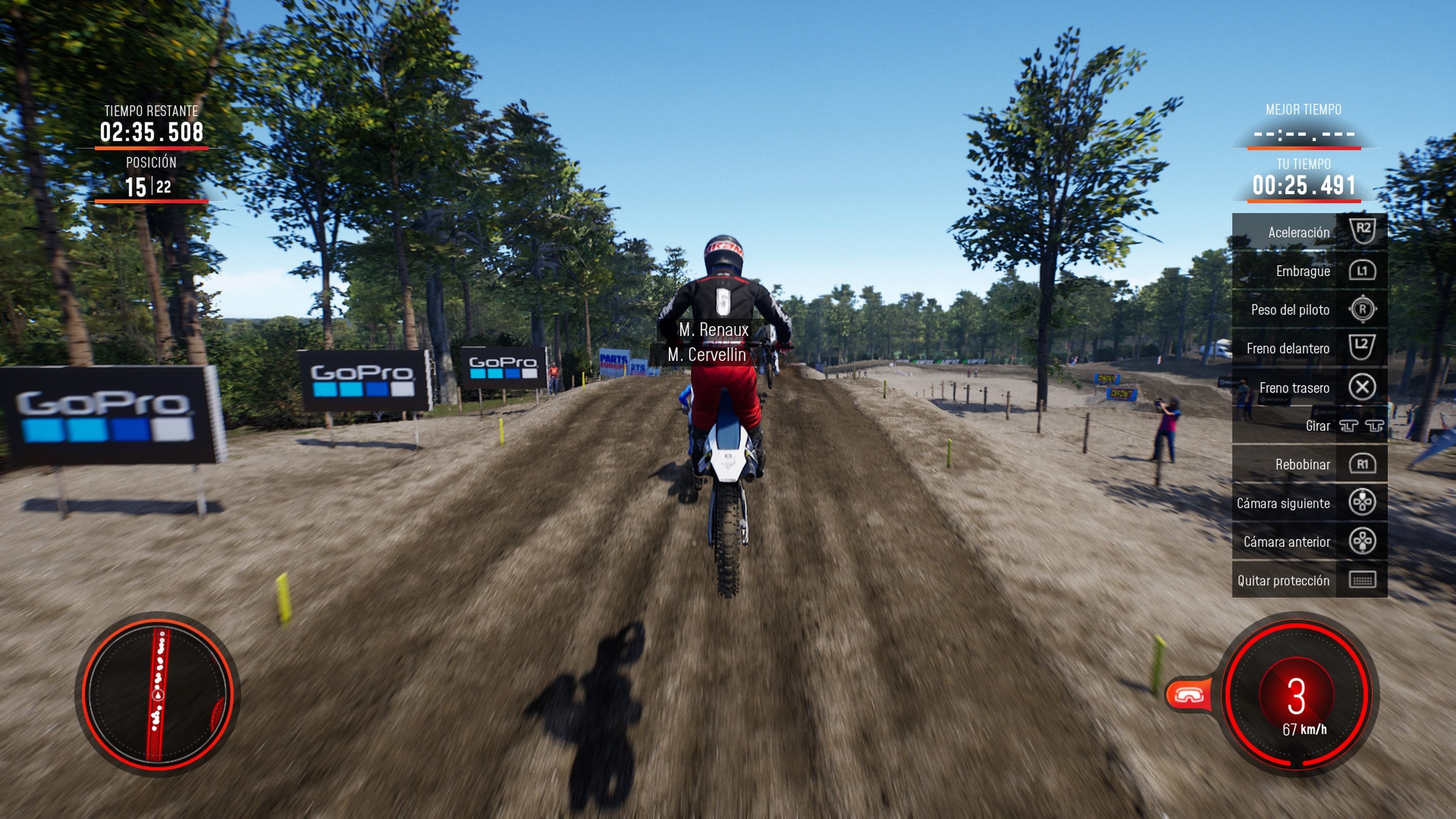 Precisamente en este aspecto encontramos la primera de las innovaciones principales que presenta esta entrega de MXGP, que no es otra que la presencia de un modo de juego inédito denominado Playground. En este caso podemos recorrer el escenario principal que deseemos (bosque, riviera o desierto) con total libertad, es decir, sin rivales de por medio y sin entrar en competición alguna si no lo deseamos. Además estos entornos son abiertos y, más allá de permitirnos recrearnos con sus diferentes zonas en las que podemos entrenar, también nos ofrecen diversas actividades en las que, si así lo deseamos, podemos llegar a competir, como por ejemplo carreras con rutas alternativas que más tarde podemos subir online. Es un intento (salvando mucho las distancias) de integrar la fórmula tan exitosa de títulos como la serie Forza Horizon, si bien en este caso todo resulta mucho más limitado. Pero bueno, nos ha parecido una innovación curiosa.