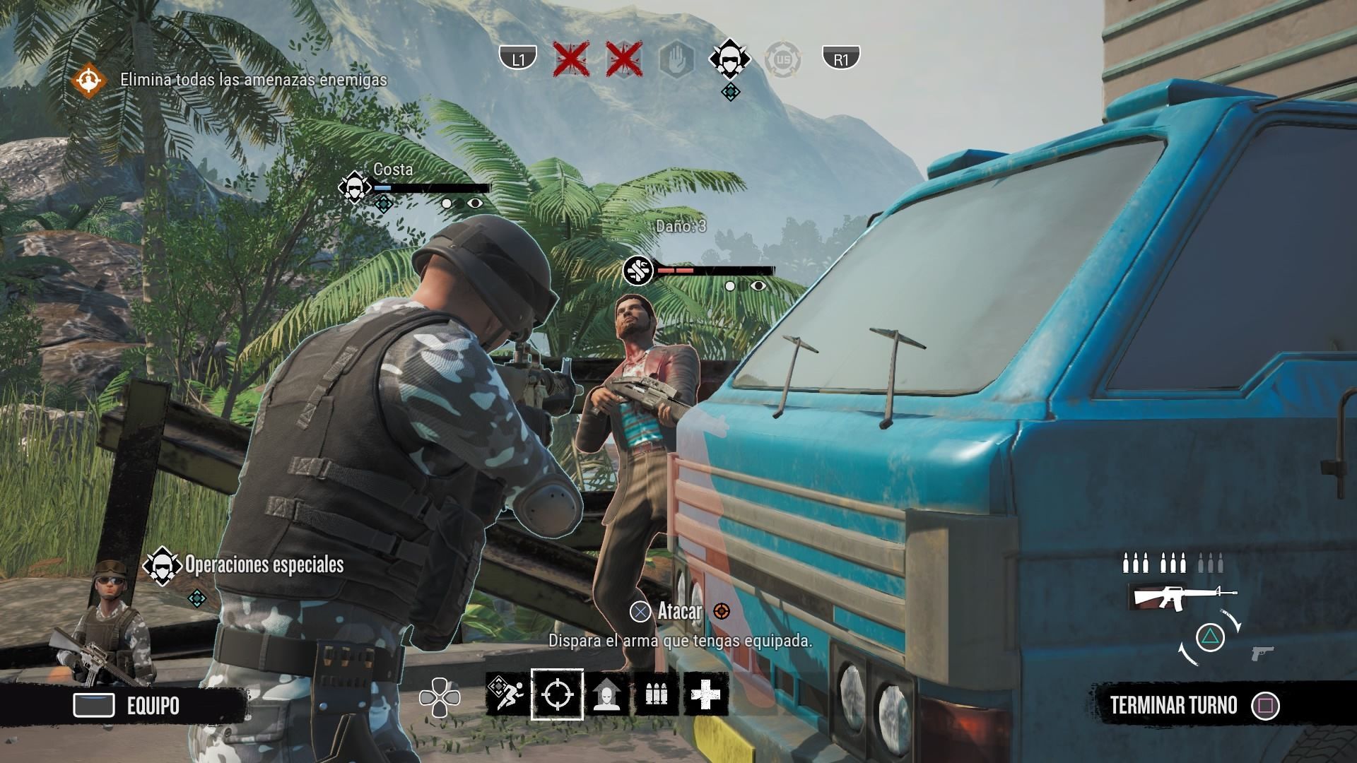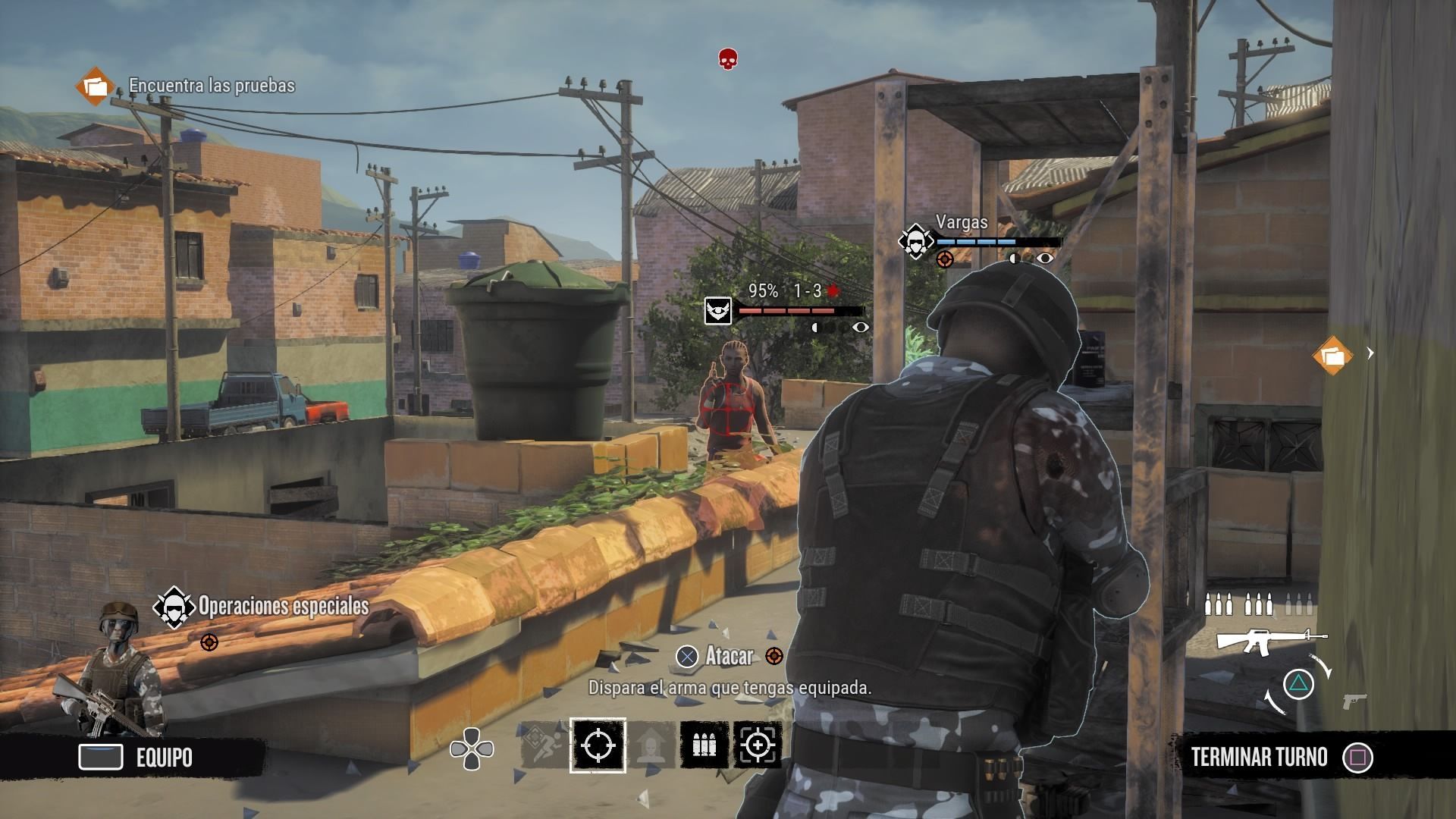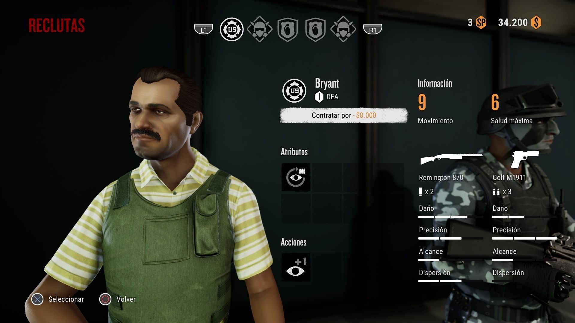 Hablamos de un título muy simple, que aunque recoge ingredientes de otros títulos, los hace bastante sencillos y directos, y como os comentábamos, siempre focalizándose en un ritmo frenético y directo en los combates. Durante nuestro turno debemos ejecutar una o varias acciones básicas, teniendo en cuenta que todo tiene un consumo y un coste, y que no siempre podemos hacer varias cosas al mismo tiempo. De esta forma, podemos movernos, atacar -si tenemos el enemigo en la línea de fuego o no está cubierto-, descansar para recuperar vida y recargar munición para nuestra arma. A esta dinámica hay que sumarle que existen hasta cinco categorías de combatientes, especialmente diversificados y específicos en el caso de la DEA, cada uno con un rol en combate muy concreto. Encontraremos a expertos en demolición y granadas, soldados de fuerzas especiales, policías colombianos poco específicos, agentes norteamericanos y reclutas del ejército. Equiparlos y contratarlos no será barato, ya que el videojuego incluye un cierto elemento de gestión -muy pobre-, que nos obligará a cuidar a nuestras unidades, muy valiosas, evitándonos el tedio de tener que volver a reclutarlos y gastar el dinero que conseguimos con cada misión.