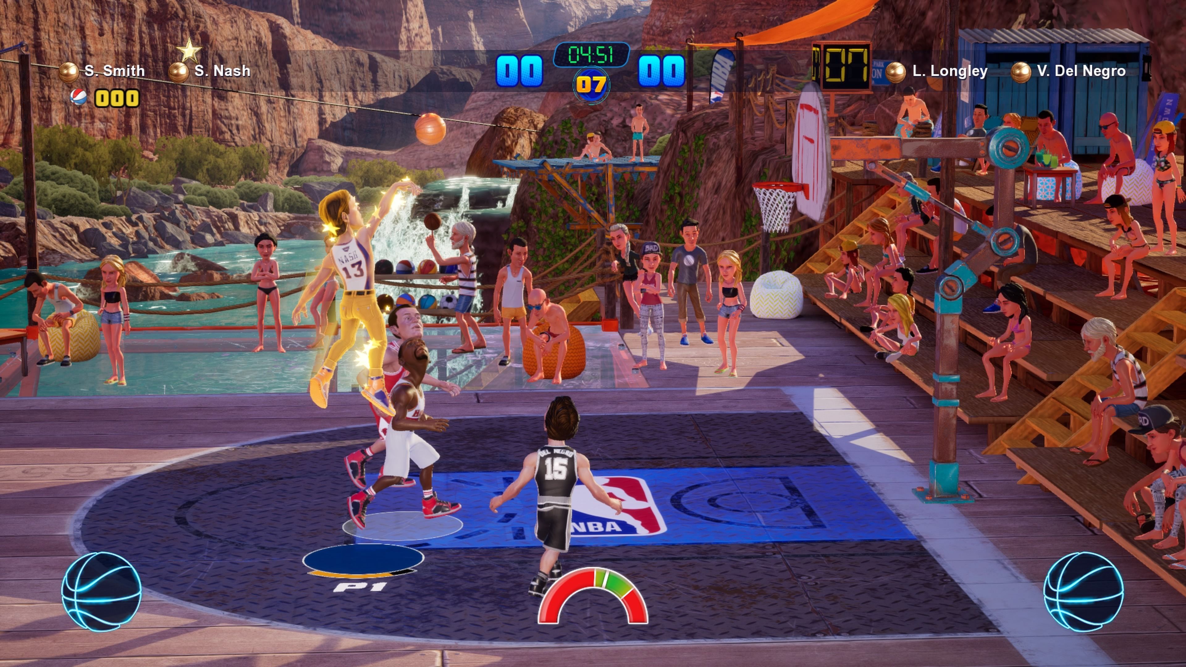 Una de las grandes novedades es que se ha incluido una barra de medición para los lanzamientos que facilita enormemente el aprendizaje, ya que nos informa de manera detallada del timing correcto y el porcentaje de éxito. La zona de acierto variará según la situación y las estadísticas de cada jugador, por lo que, aunque NBA 2K Playgrounds 2 no es un simulador que exija conocer las características de todos los jugadores, hay variaciones importantes entre ellos.