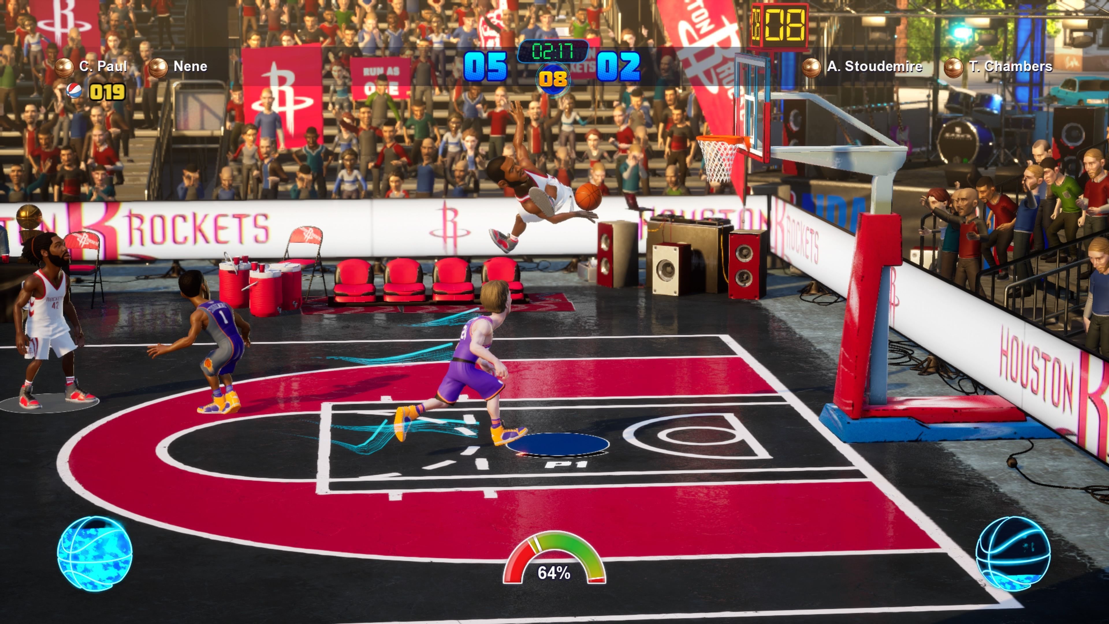 El título vuelve a incluir la Lotería de Modificadores, un añadido que podremos activar tras encadenar una serie de canastas, robos, rebotes, tapones o alley oops. Con ello aumentaremos el valor de nuestros puntos o, por ejemplo, bajaremos las estadísticas del rival, una pequeña aleatoriedad muy divertida que puede cambiar por completo el rumbo de los partidos. Otro elemento que continúa intacto es la barra de resistencia, que una vez más vuelve a ser un factor determinante en ataque y defensa. A medida que corramos, empujemos, robemos o driblemos, la barra irá disminuyendo, teniendo que esperar unos segundos para recargarla.