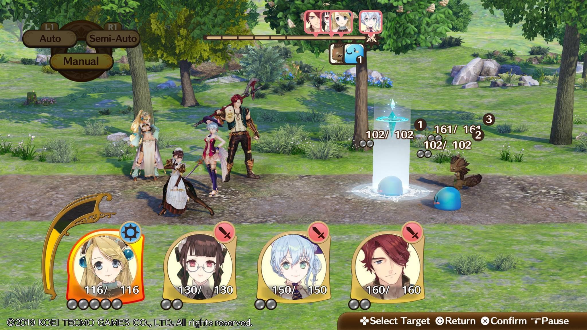 Si en Atelier los combates muchas veces quedaban en un segundo plano, en Nelke & the Legendary Alchemists son un mero trámite por dar más variedad al ritmo de juego. La cámara adopta una vista lateral y en esencia es el sistema típico: una barra de tiempo que muestra el orden de los turnos, comandos de ataques y habilidades. Hay personajes de ataque y de ayuda –se sitúan en la retaguardia- estados alterados y naturalmente aquí podemos hacer uso de esos objetos que hemos estado sintetizando. Existe la posibilidad de hacer el combate automático o semiautomático por si no nos interesa esta parte del juego, y perder no tiene más penalización que detener la investigación.