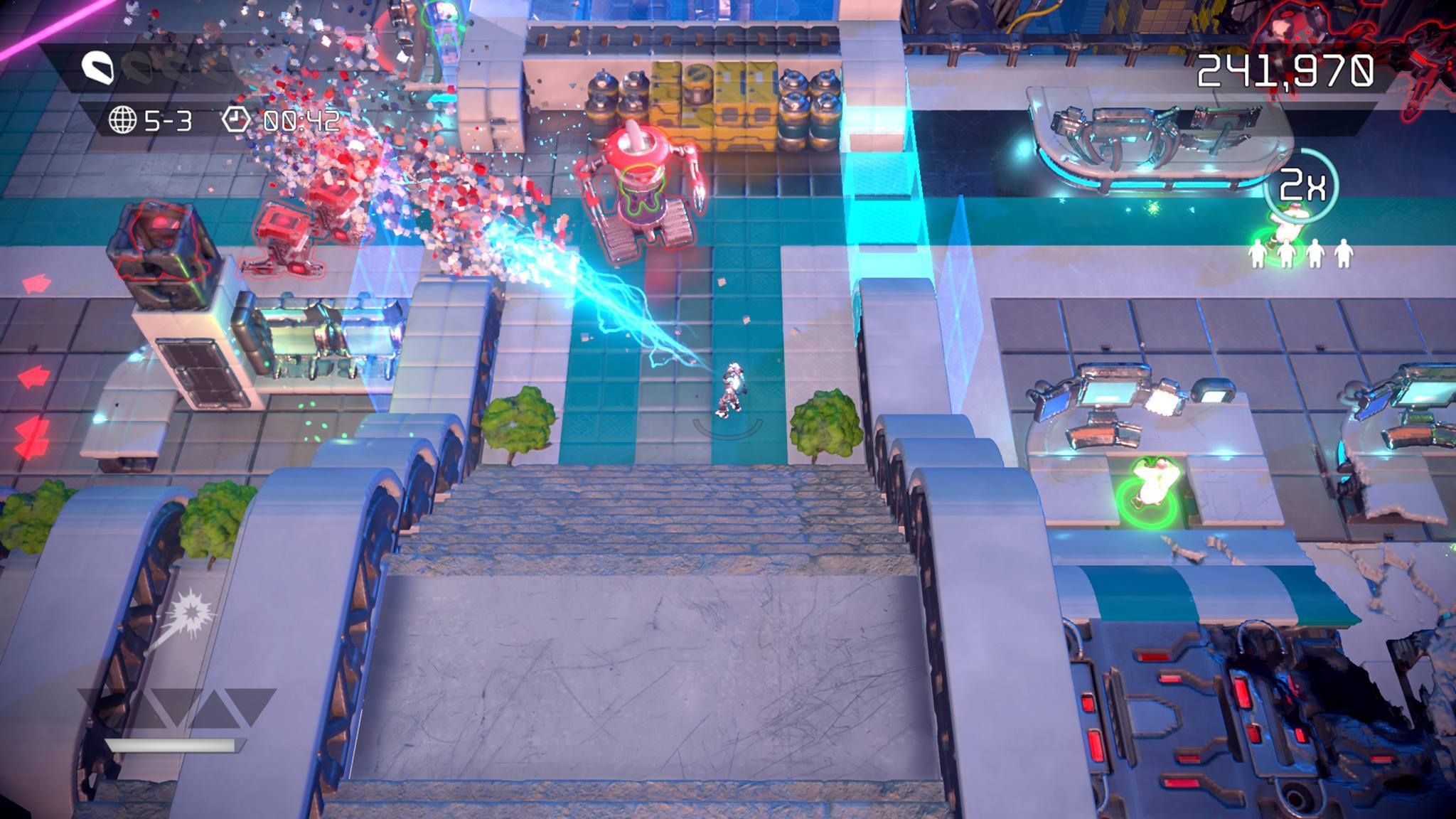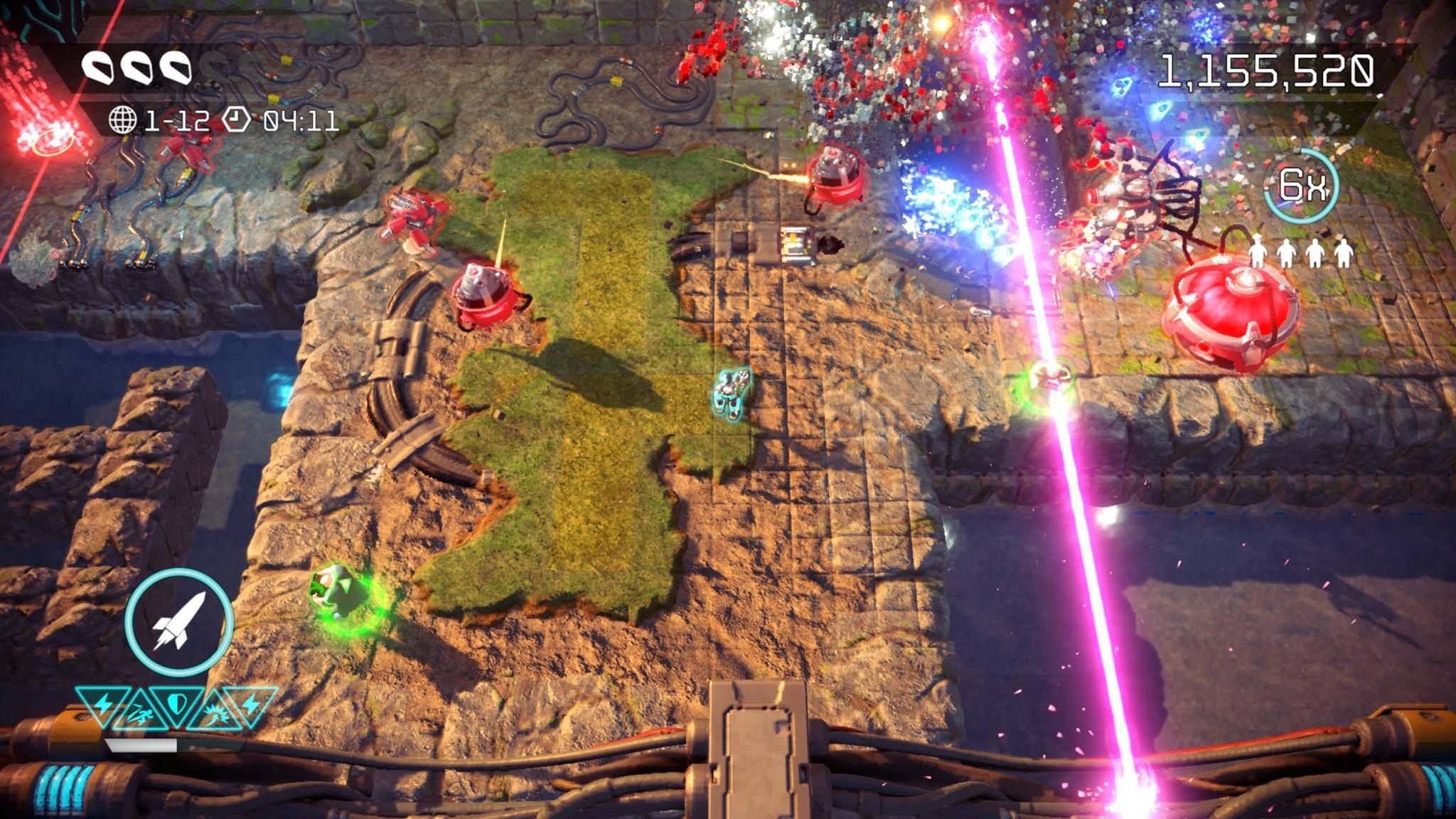 Nex Machina es un twin-stick shooters; un juego de disparos de perspectiva cenital en el que con un stick nos movemos y con el otro disparamos. Las mecánicas son sencillas, y tan sólo se alteran por la posibilidad de utilizar un esquive o un disparo especial con los botones superiores. Eso sí, tendremos que utilizar toda nuestra habilidad y estrategia para salir vivos de un juego bastante desafiante.