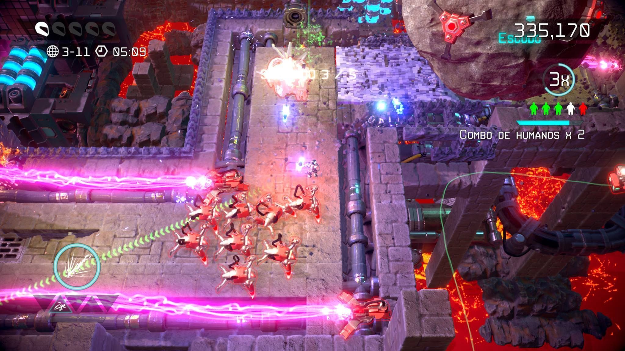Hay algunos detalles que os resultarán familiares, como los potenciadores o tener que rescatar humanos para aumentar nuestra puntuación. Los potenciadores pueden mejorar nuestra arma hasta cinco veces, ofrecernos protección adicional o diferentes tipos de esquive, así como un arma adicional más potente. En función de nuestro estilo de juego y la situación en la que nos encontremos un arma nos vendrá mejor que otra, y mientras el potenciador está en accesible, irá rotando entre sus diferentes variables, por lo que tenemos ese pequeño componente estratégico de esperar para cogerlo en el momento apropiado a riesgo de perderlo o morir.