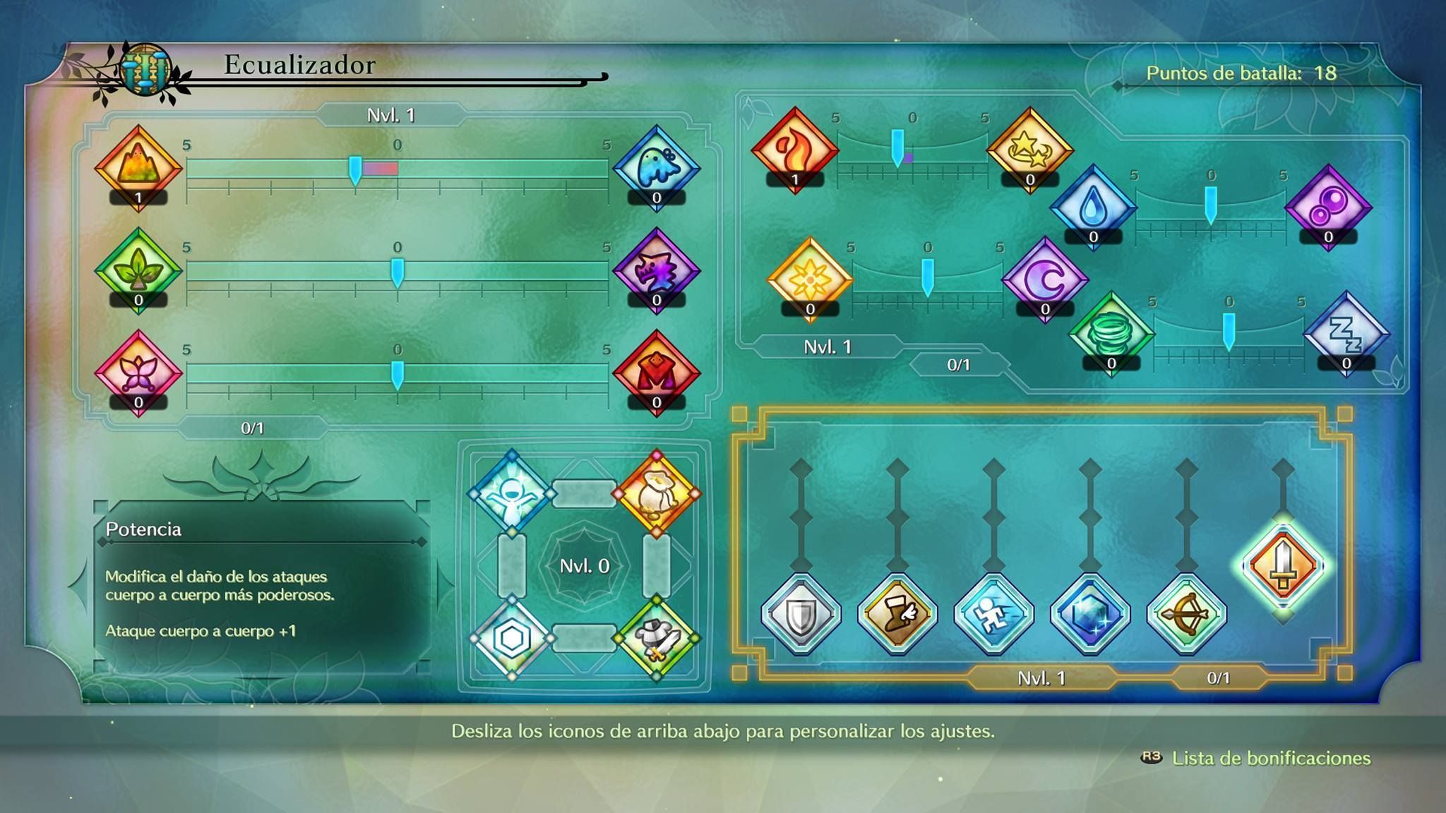 Por una parte tenemos el ecualizador, un sistema que define nuestras fortalezas gastando puntos y ajustando unos deslizadores. En general mejorar un aspecto nos impide hacerlo en otro: si causas más daño a monstruos tipo metálico no podrás fortalecerte contra tipo baboso. De todas formas estos parámetros son editables en cualquier momento fuera de la batalla y si sabes de antemano por el tipo de zona que te enfrentas a muchos enemigos de una misma categoría puedes configurar el ecualizador en tu beneficio.