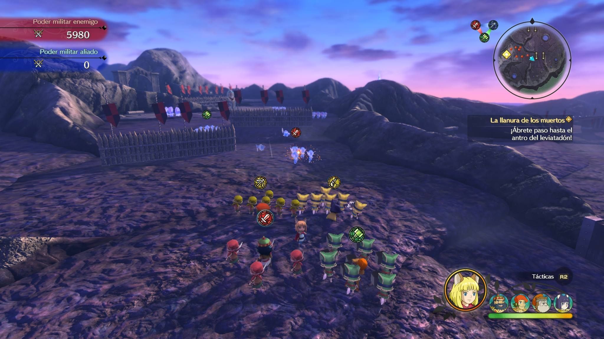 Estas batallas recuerdan un poco a la estrategia en tiempo real de la serie Pikmin. No luchamos con el propio Evan, sino que nos acompañan hasta cuatro escuadrones de diferentes clases –arqueros, caballeros con espada, etc-. Un sistema piedra-papel-tijera indica que clases son mejores que otras, de manera que rotamos al grupo para que se enfrenten los bandos que nos interesan. Según acumulamos unos puntos, podremos recuperar las bajas y activar ataques especiales, como bombardeos aéreos. En el reino es posible fortalecer al ejército.
