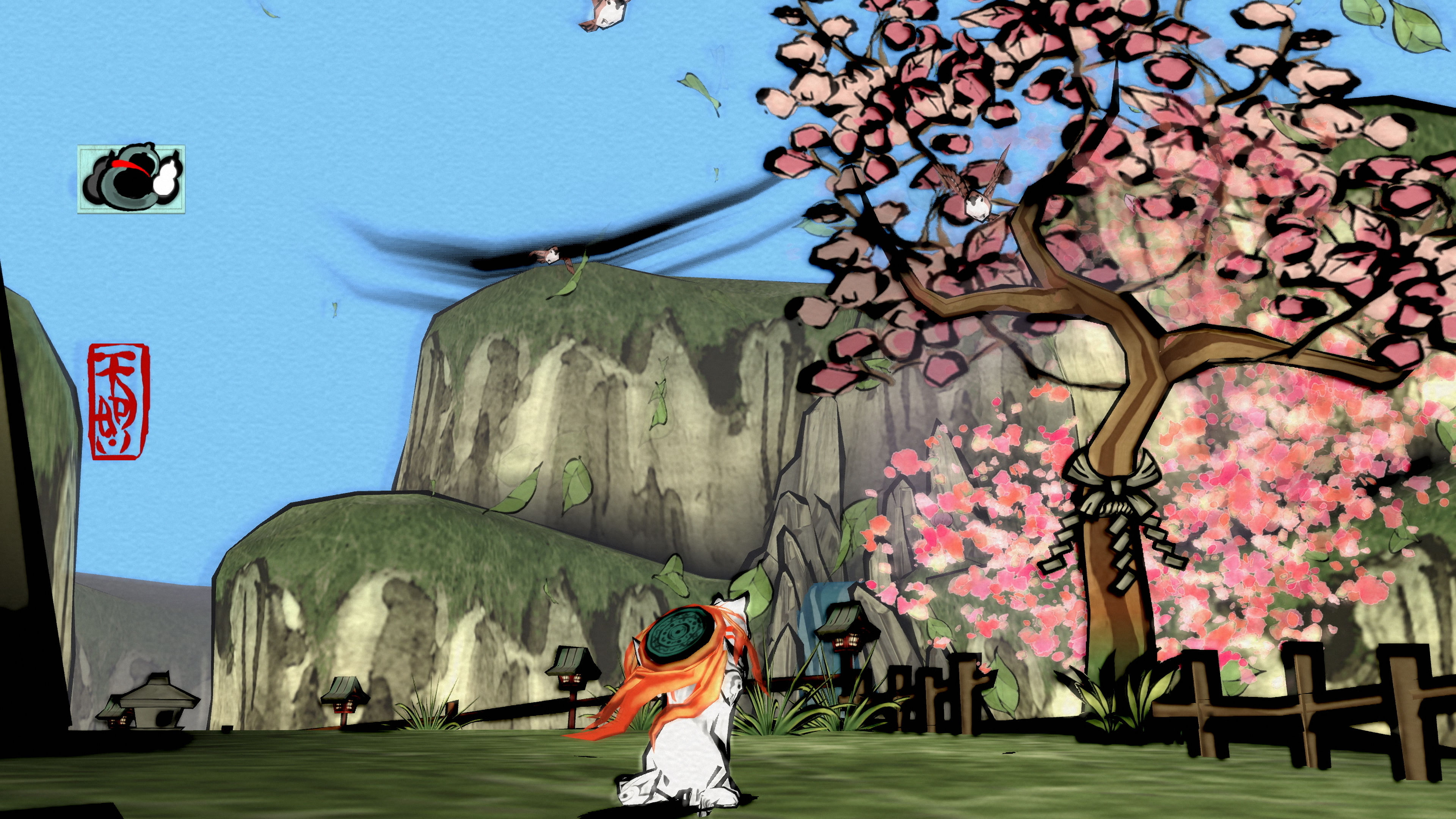 No queremos incidir mucho en su apartado artístico porque Ōkami es mucho más que una fachada bonita, pero es obvio que el juego permanecerá asociado a un estilo gráfico muy determinado, un trazo de pincel con líneas inestables que encaja muy bien con la ambientación de la historia y la música. Música, por cierto, también de inspiración muy nipona, con intensos tambores para las luchas y melodías más tranquilas durante la exploración.