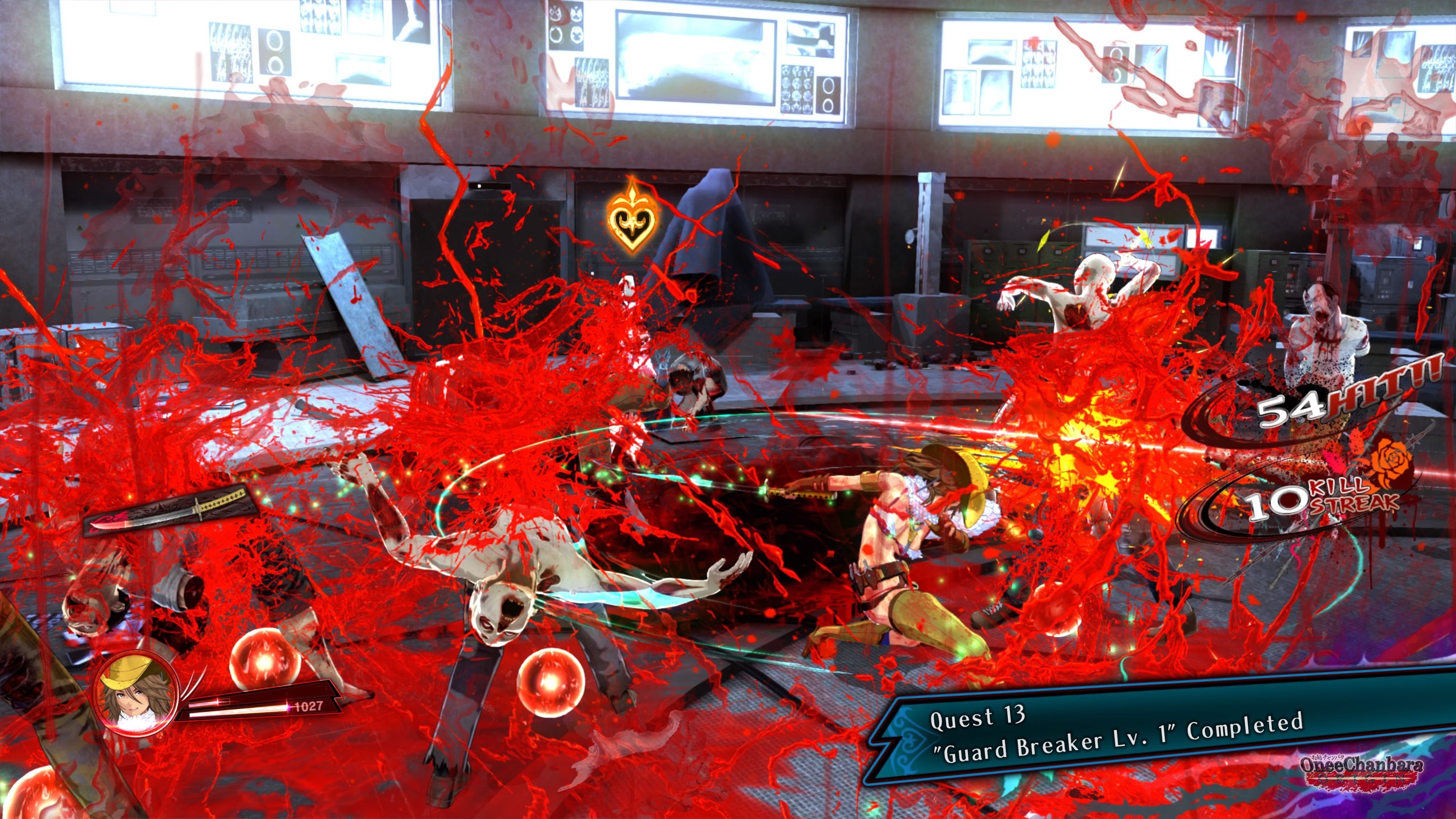 A este esquema básico se suma una curiosidad, y es la necesidad de limpiar nuestra arma cada cierto tiempo (como si la "recargáramos"), dado que a medida que se llena de sangre esta va perdiendo eficacia. También nos ha gustado el hecho de poder cambiar el control de la protagonista en mitad de un combo, algo que si bien ya hemos visto en multitud de títulos previos, sigue teniendo su interés. Como veis estamos ante una obra sencilla que ofrece una jugabilidad muy encorsetada e invariable, dado que la pluralidad de las misiones brilla por su ausencia al igual que sucede con la diversidad de escenarios y monstruos, muy escasa. La gracia de este título se basa en su simplicidad y, también, en el elevadísimo nivel de gore que se deja ver en cada batalla, siendo posible contemplar desmembramientos, decapitaciones y demás "lindezas" con total normalidad.