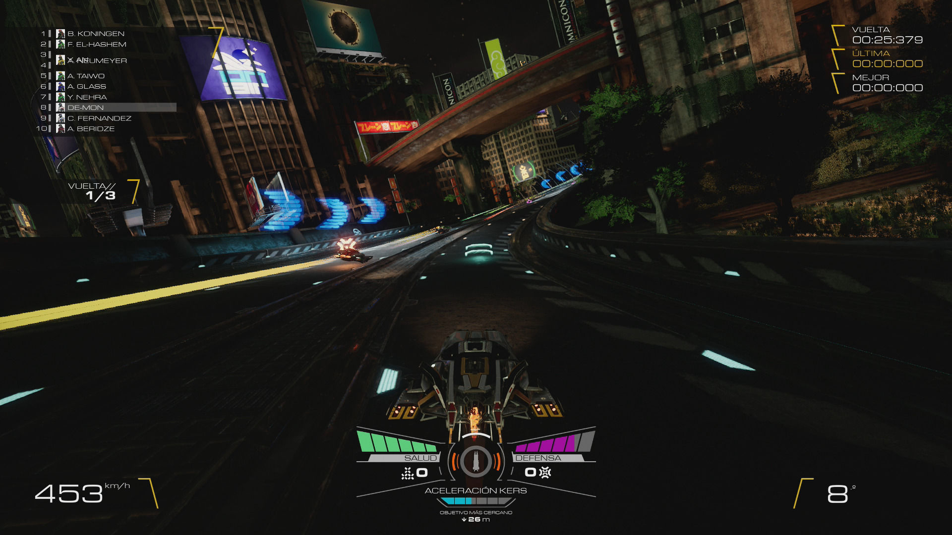 La ambientación es sin duda uno de los puntos fuertes del juego. Utiliza Unreal Engine 4, igual que Redout, pero con el toque de suciedad que mencionamos antes y que recuerda a los primeros Wipeout. El rendimiento en consolas funciona estupendamente, con las opciones de ver cada circuito en día y noche, y esos logotipos futuristas marca de la casa The Designers Republic en pantallas o decoración de carteles. Quizás se le puede achacar una falta de personalidad o dirección artística que lo haga más único y alejado de sus referentes, pero no cabe duda que su intención era la de un sucesor espiritual que llamase la atención al primer vistazo.