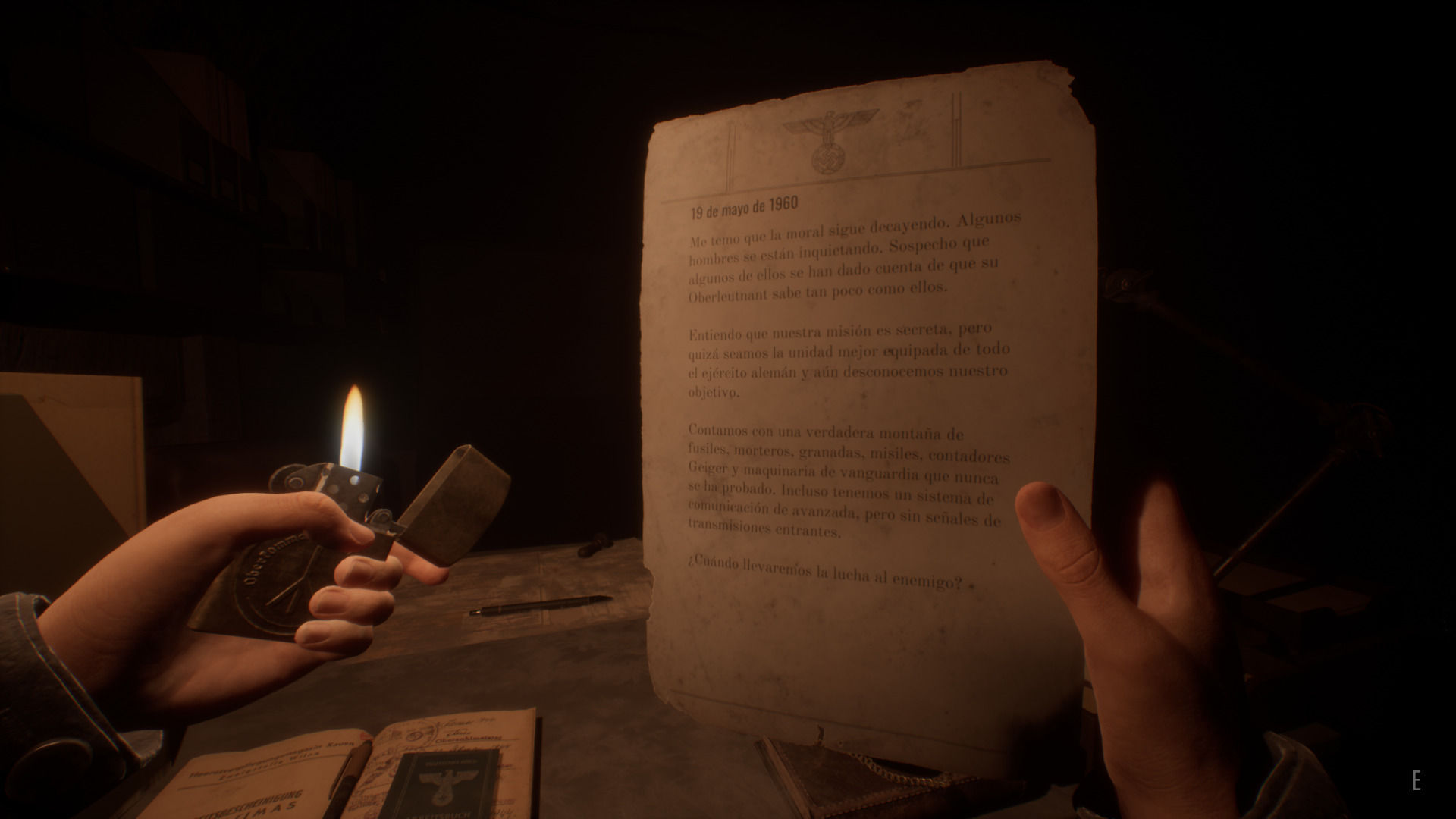 Es la otra parte de esa historia la que nos ha parecido mucho más interesante: lo ocurrido en el búnker años atrás. De igual modo que descubrimos el caos en el que sumió Rapture en Bioshock gracias, sobre todo, a la narrativa ambiental, aquí se usa el mismo recurso. A través de los detalles de los escenarios, de las grabaciones de voz que encontramos aquí y allá, y por supuesto, de las muy frecuentes notas de distintos personajes, se nos narran conflictos, experiencias, reflexiones y situaciones espantosas de una sociedad pasada que refleja (y obviamente critica) cómo el nazismo ve al individuo como un engranaje más dentro de una maquinaria de producción. La construcción de ese mundo, del que vemos apenas unos cimientos resquebrajados, es mucho más redonda que la trama principal de Szymon, Ewa y el padre perdido.