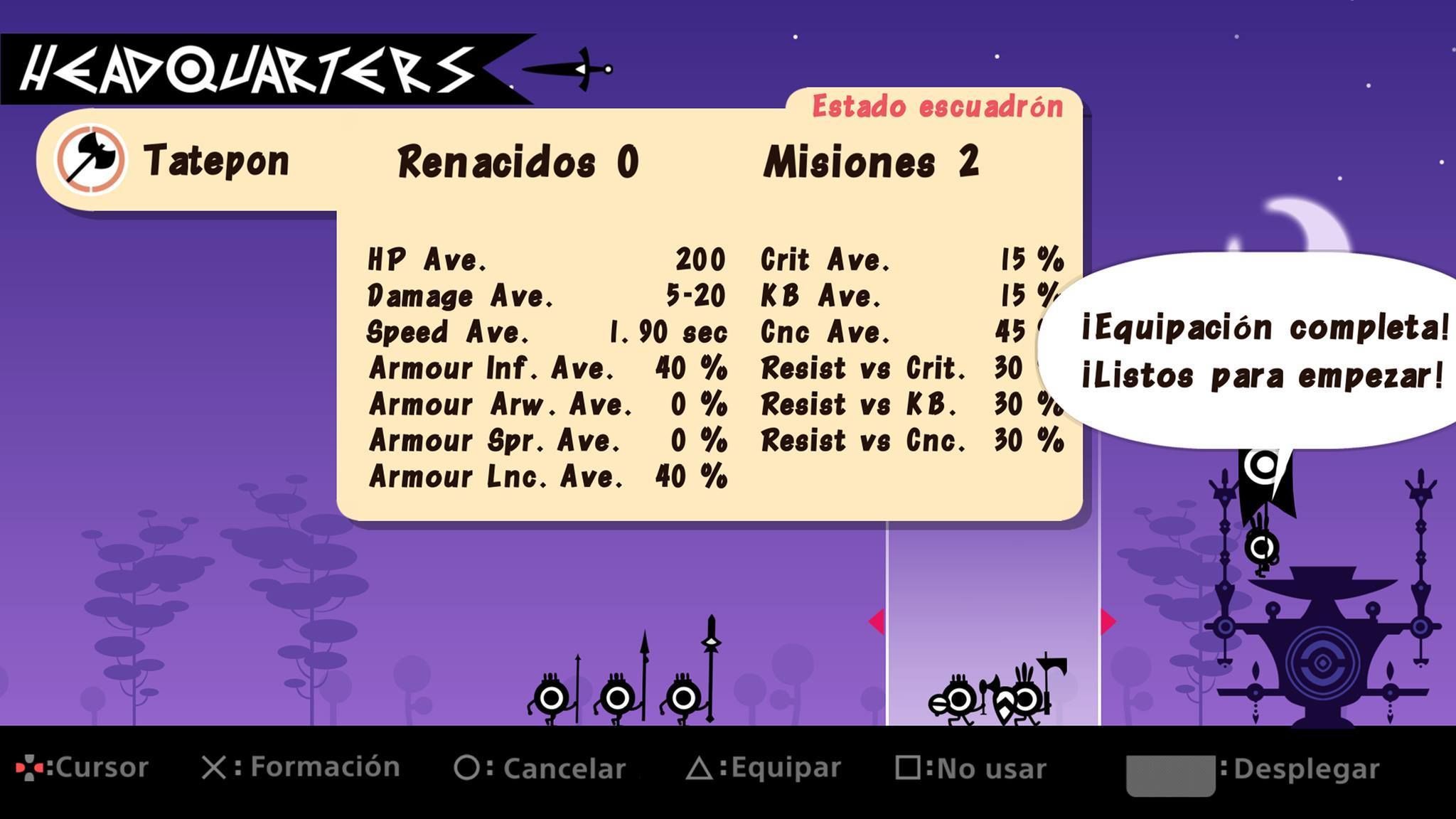 Cuando dispongamos de muchos patapon será el turno de editar la formación y preparar el equipamiento. El primer grupo en línea de batalla debería ir para los soldados más fuertes, con espadas, hachas y escudos. Serán los que más daño van a recibir por norma general, así que prepara bien el frente del grupo. Detrás suelen ir los soldados con lanzas que no dudan en tirar a sus enemigos. En la retaguardia deberían ir los arqueros, con más rango de ataque pero también más debilidad al combate cuerpo a cuerpo. Hay algunas clases más pero sólo podremos entrar en batalla con tres tipos a la vez.