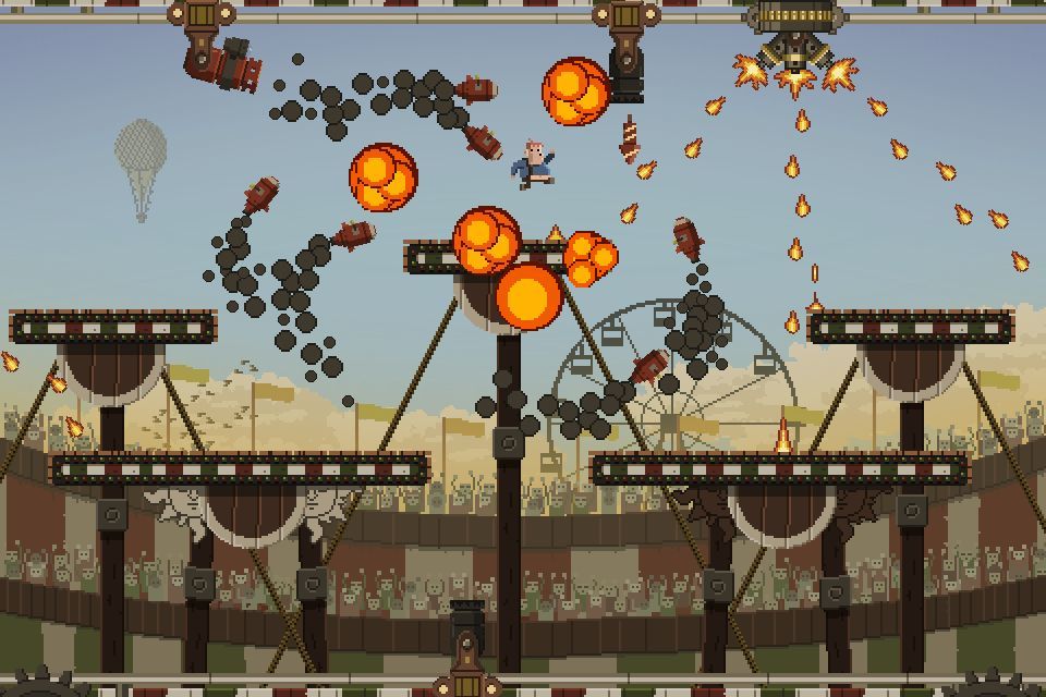 La propuesta que nos ofrece este título no puede ser más sencilla. El modo Campaña, que viene a ser el principal, nos insta a salir con vida de las ansias de carnaza del director de un circo muy particular y su público insaciable. ¿Y qué es lo que debemos hacer? Pues simplemente, saltar de un lado a otro de un escenario fijo sin scroll lateral conectado entre ambos lados (es decir, que si te "sales" de los límites de un lado vas a parar al otro) y esquivando todas las trampas que nos preparan. Treinta niveles englobados en tres zonas distintas (que debemos ir habilitando) que ponen a prueba nuestros reflejos de manera desatada.